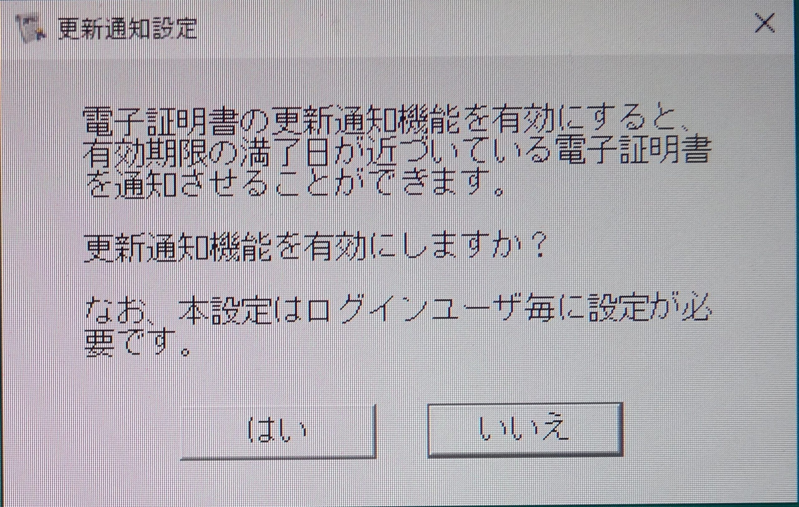 ①[更新通知設定]画面で、[はい]ボタンをクリックします。
