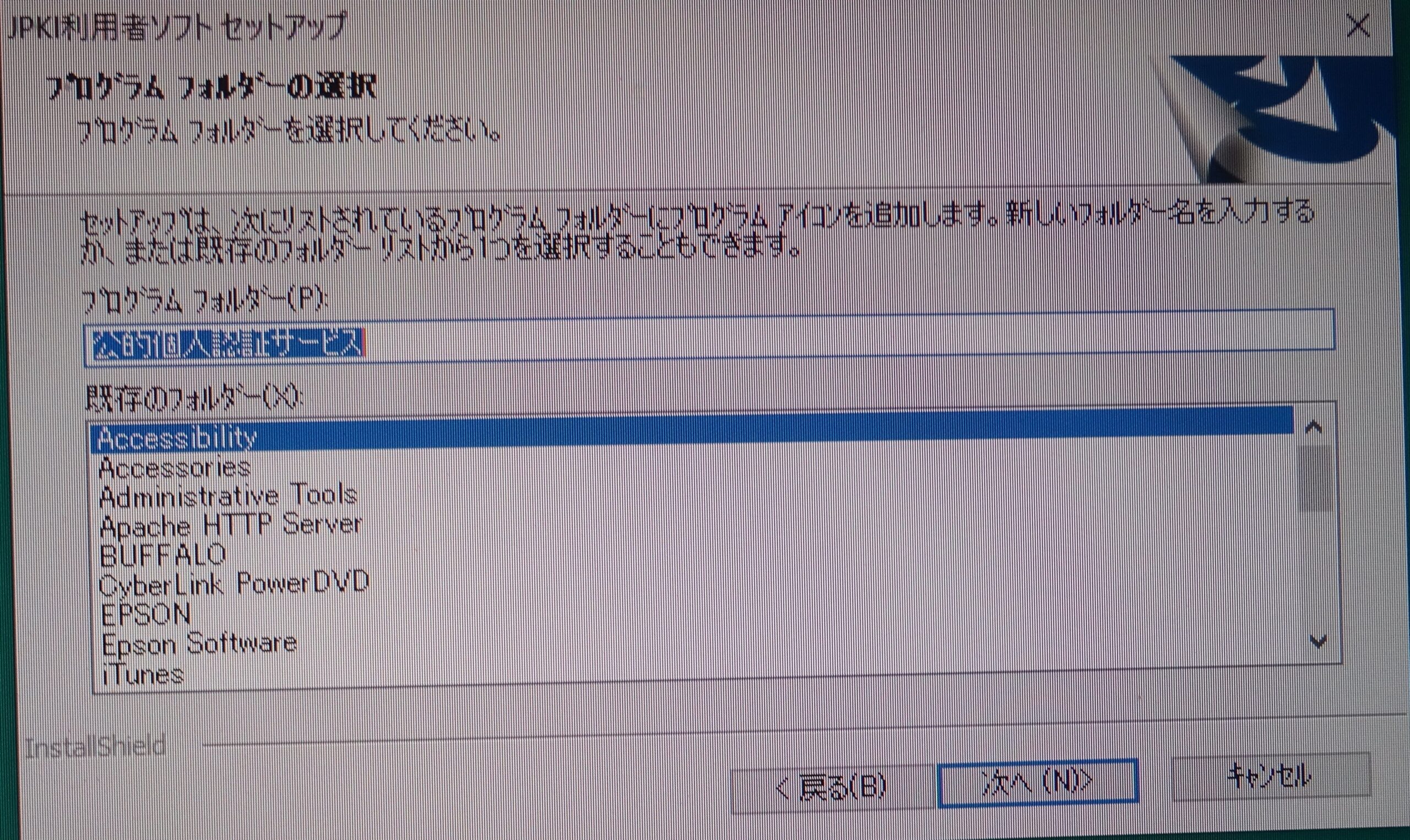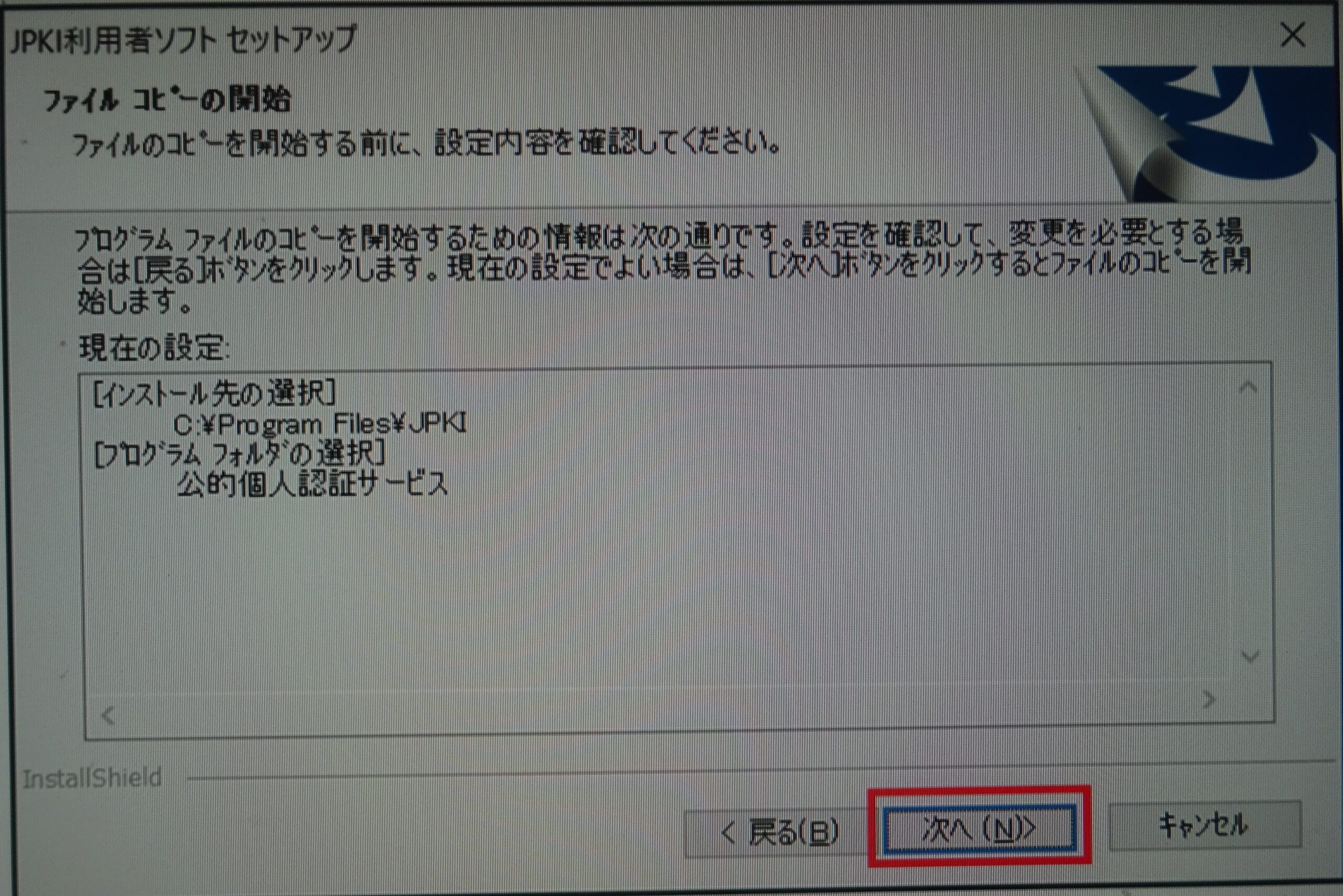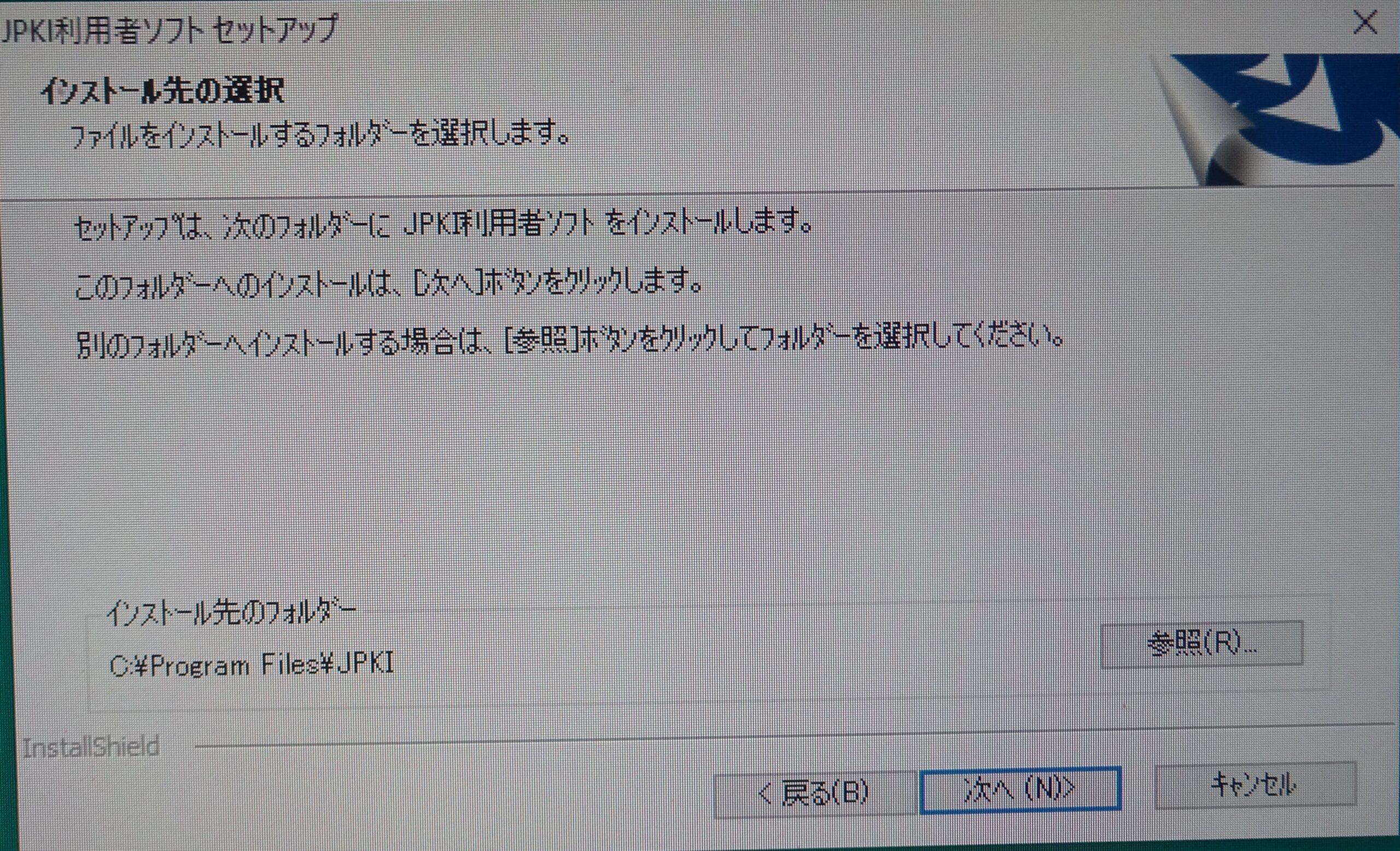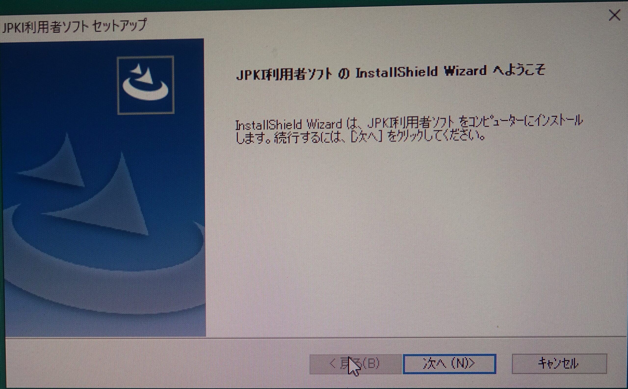 2.[JPKI利用者ソフトのInstallShield Wizard へようこそ]画面で、「 次 へ」ボタンをクリックします。