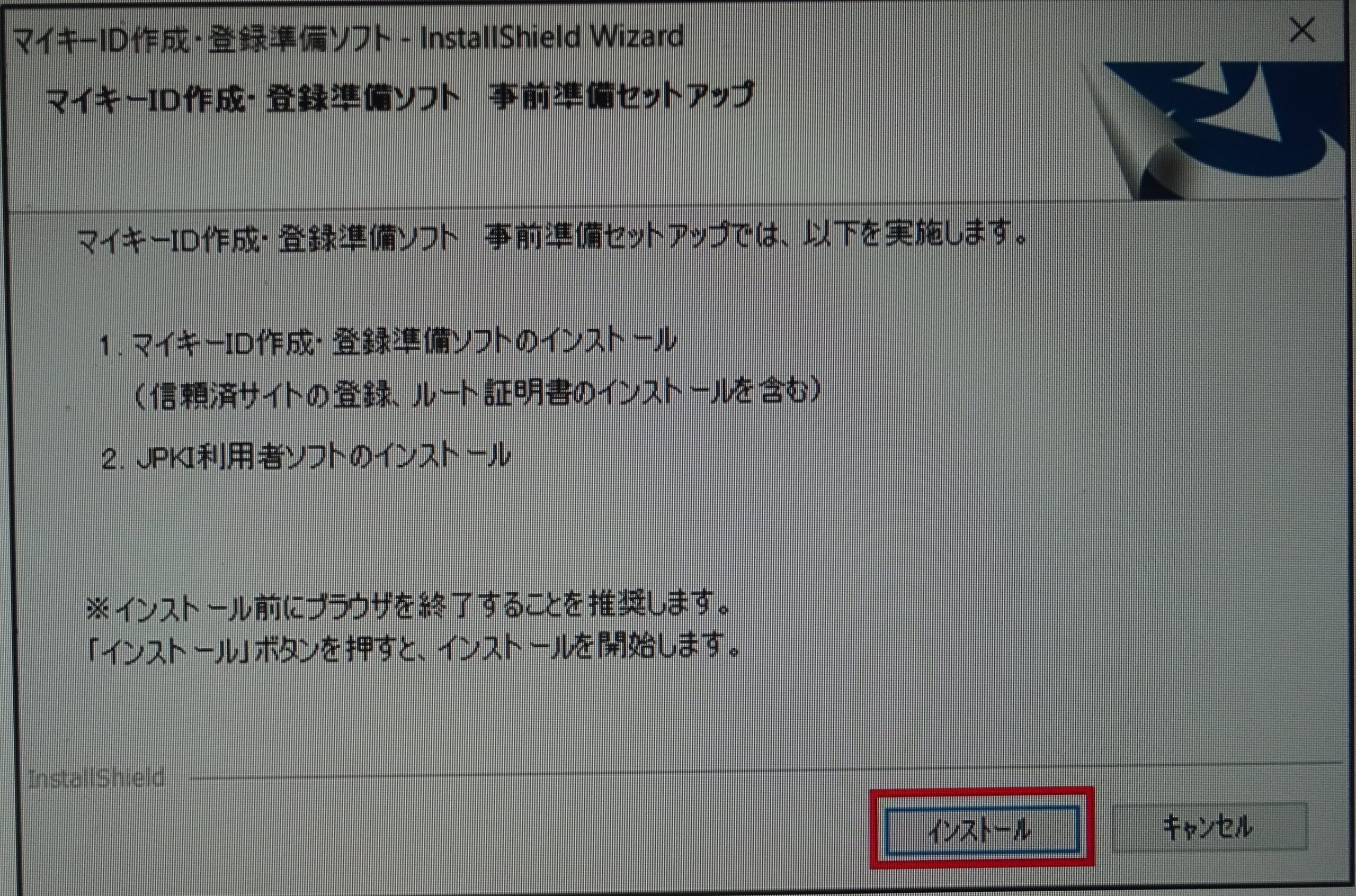 1.[マイキーID作成・登録準備ソフト 事前準備セットアップ]画面で、[インストール]ボタンをクリックします。