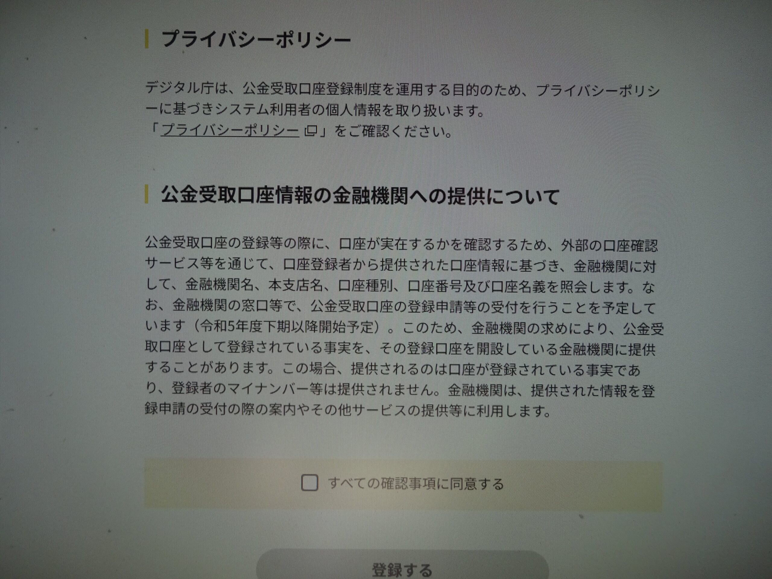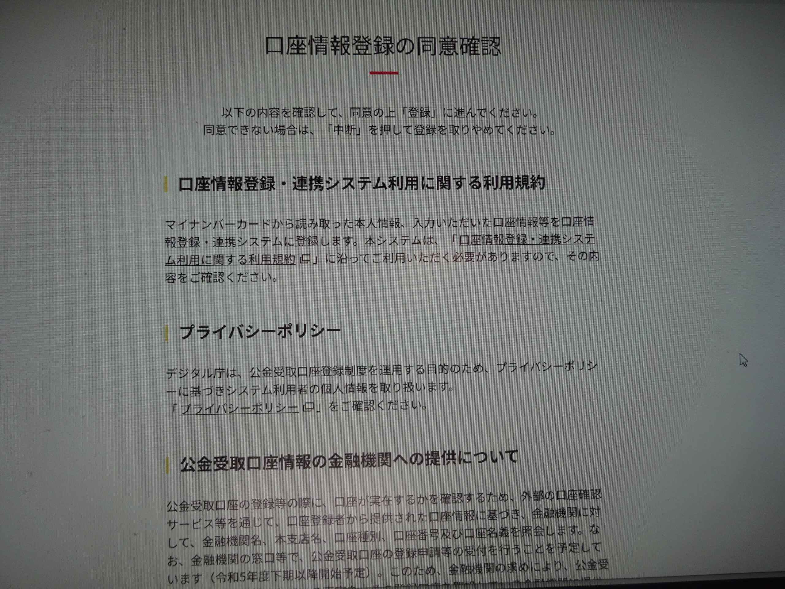 5.公金受取口座情報を入力します。 因 みに、口座情報登録の同意確認であります。