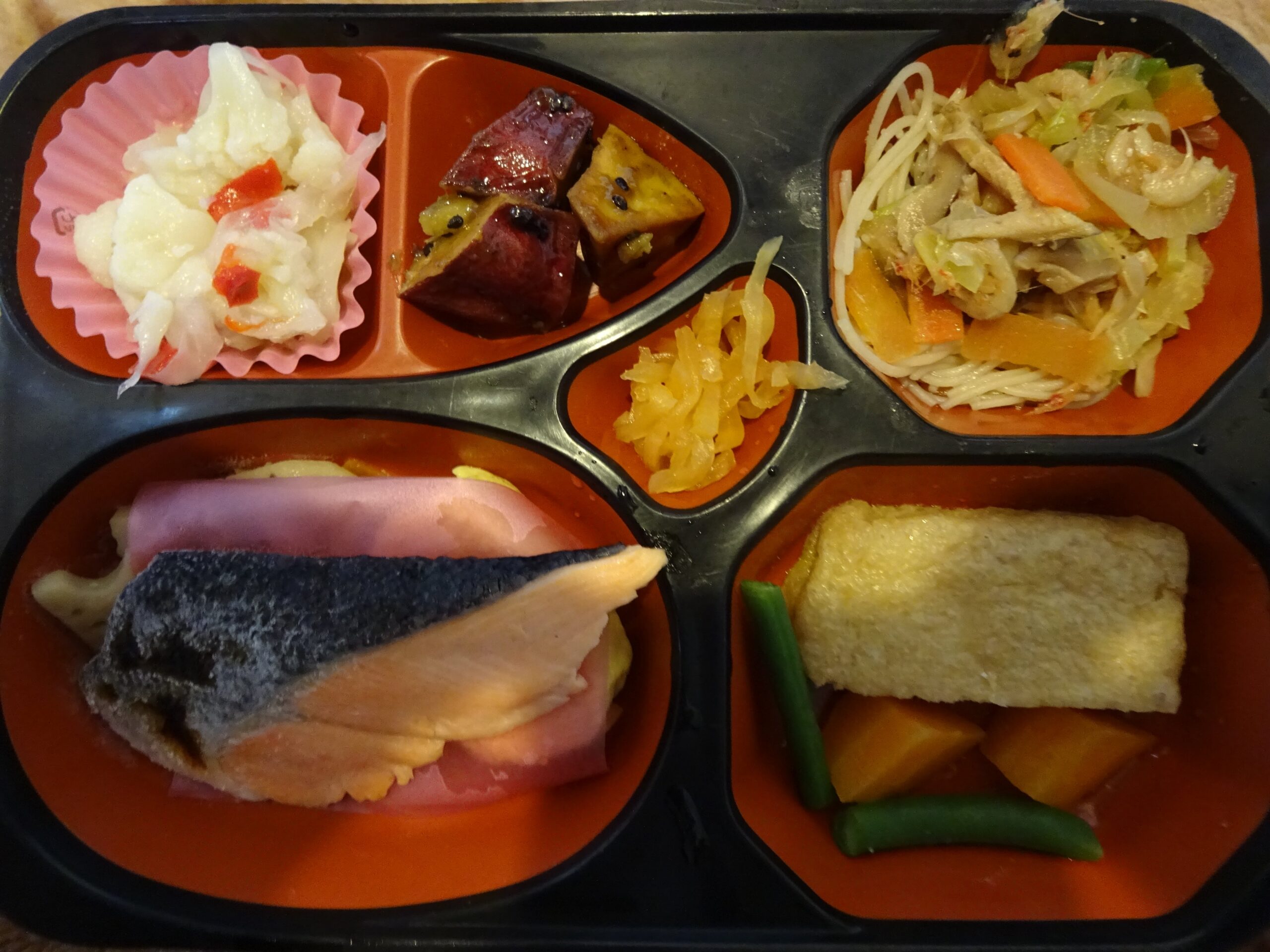 以上などが、父親の朝食 そして 昼食です。朝食も 昼食も、おかずの内容は ほぼ同じです。それから、宅食の おかずの配達が、週7日間コースと致しまして 入って来ます。なお、母親のよりますと、病人食のようである とのことでした。それで、「カロリー や 塩分などの計算がなされているのでありましょう。」と回答しました。