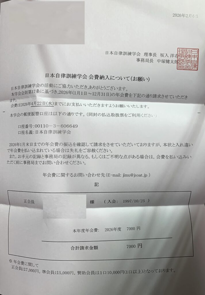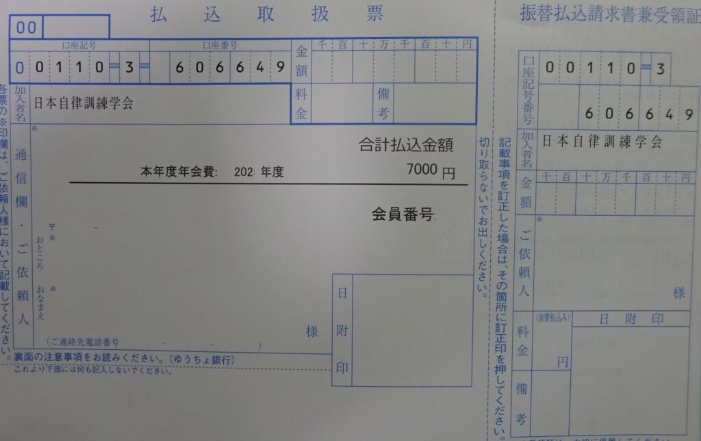 日本自律訓練学会の年会費請求が来ました。因みに、依頼人の欄は 事前に 記載されておりません。なお、当方で 記載しなければなりません