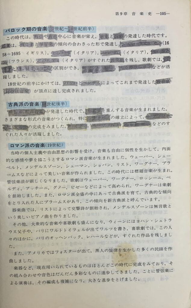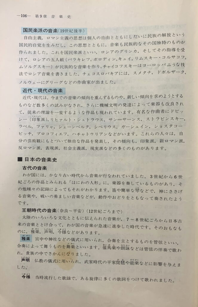 も 充分に御承知のことであらせられ 御同様であらせられると存じ上げますように、西洋の音楽史でも 古典派の音楽、ロマン(英語:Roman)派の音楽、国民学派の音楽 そして 近代の音楽でしたら、まだ 答えられると思いました。なお、この「中学音楽通論」は 副読本です。そのうえ、この音楽史を 授業で習った訳ではありません。重箱の