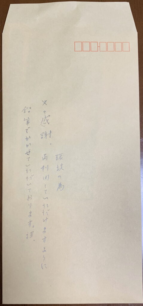 の100%ジュースなどを それぞれ 三人分 用意しました。序で乍ら、神様の 御遣いであることを 2回 伝えました。因みに、今年 最初でありますので、『今年も、何卒 宜敷くお願いします。』と伝えました。なお、母親から 引き継いだ 乃木神社 そして 浄化で 大祓の神である 住吉神社でも、年に 二回 大祓を 行なってまいりました。それで、処理後の大祓の形身代は 穢れた存在としてみられているため、お金と一緒にしないのであります。そこで、いつものことでありますが、 大祓の形身代の袋と奉納金のそれを別々にしたのであります。ところが、大祓の奉納金 千円を 上の画像のように 丁重に 手書きをした袋に入れて 手渡しました。すると、その氏子会役員(取扱世話人)によりますと、大祓の形身代の袋に入れ替えるとのことでありました。すなわち、穢れた存在とされる 処理後の大祓の形身代 と 奉納金を 一緒にしたのであります。それで、昨年 つまり 令和7年12月19日(金)に 手紙で伝えました。すると、その氏子会役員(取扱世話人)によりますと、皆 そうしている とのことでありました。そして、誠に有り難いことに、今回 『本部に言っておく。』とのことでありました。そこで、『畏れ多いことですが。』と答えました。