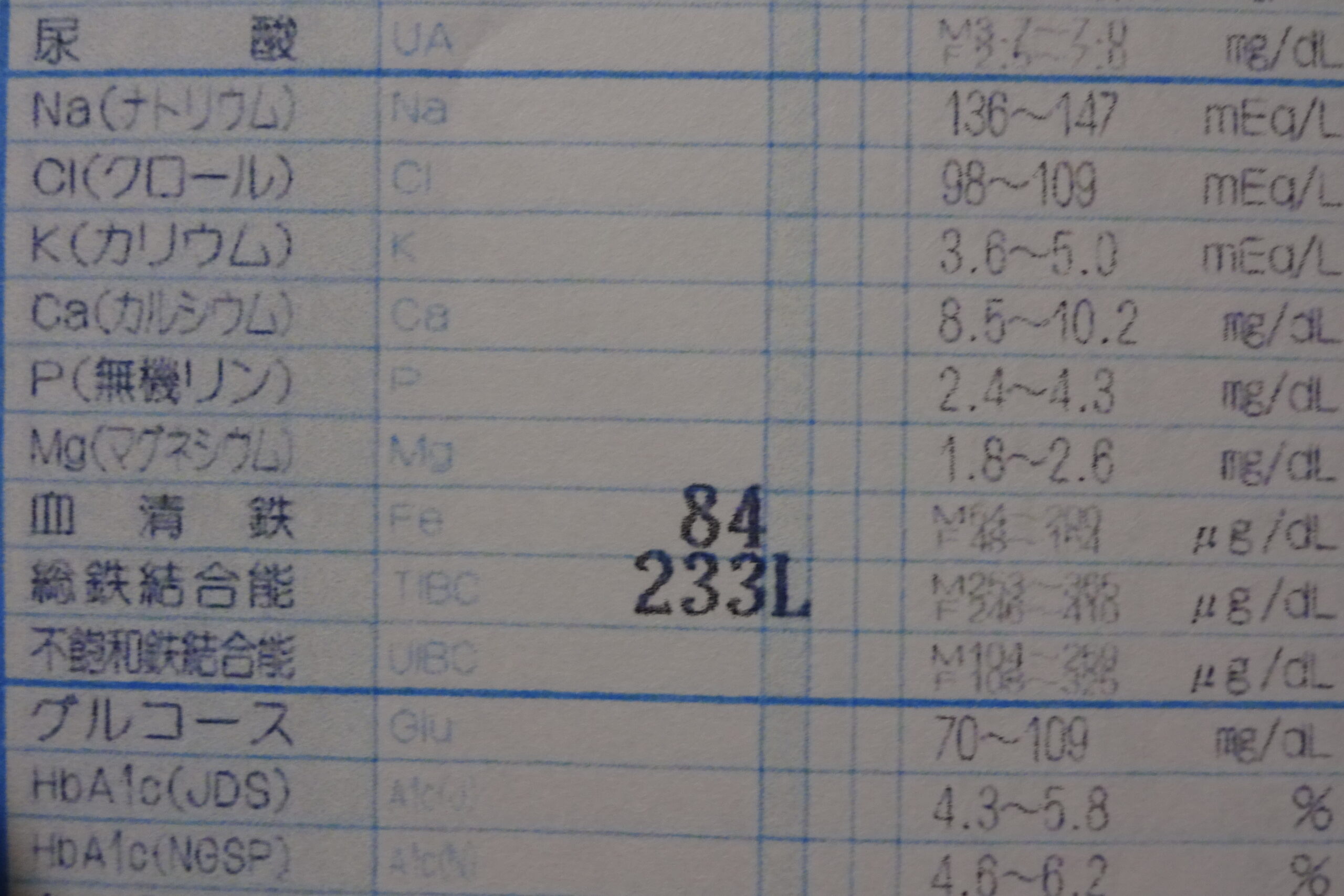 鉄欠乏性のanemiaでしたら、食事療法で対応出来ます。(後略)】と記させて頂きました。その循環器内科医(女医)に 血液検査の結果を見せましたら、誠に有り難いことに、腎機能を示す クレアチニン(CRE)が1.19なので 腎性のanemiaは考えにくいとのことでした。そして、誠に有り難いことに、上記の如く 当方が直面化したように、食事療法でいいとのことでした。なお、血液検査の結果(腎機能)につきましては、以下でも掲載致します。(後略)』と記させて頂きました。この膠原内科医に その循環器内科医(女医)の言葉を伝え 腎性のanemiaではないのでは と直面化しましたら、誠に有り難いことに 腎性のanemiaではないと認めました。(中略)11回前(11月12日)、10回前(12月10日)、9回前(1月14日)、8回前(2月18日)、7回前(3月25日)、6回前(4月22日)、5回前(5月23日)、前々々々回(6月24日)、前々々回(8月26日)、前々回(10月21日)、そして、前回(12月16日)に続いて、今回も 口実は 前述のanemiaのことで 血清鉄を調べたいからとのことであり 血液検査の為の採血とのことでした。ここ最近では、12回連続で採血しています。因みに、前述の 去る4月11日(土)の『親の受診に付き添っていること・12(循環器内科医[女医])』のブログ の循環器内科医(女医)からも見せて欲しいとのことで、この血液検査の結果を持って行っていますが、採血が多過ぎるとのことでした。また、母親は採血が多いので、『何で採血するの。』と嫌がっています。去る1月14日(水)の『【三つ子の魂百まで】の教育』のブログ にも、ストレッサー(英語:stressor)が掛かると、退行すると記させて頂きましたが、退行して子供還りをした母親を目に致しました。採血後、母親によりますと、疲れたので今日の食事は任せるとの旨でした。前述の 去る10月8日(水)の『親の受診に付き添っていること・1』のブログ の最後に記させて頂きましたように、母親を守ることは自分の使命の一つであると思いました。この膠原内科医に気付いてもらうように、継続して 心より祈らせて頂いております。(後略)」と記させて頂きました。去る12月16日の血液検査の結果で、下の画像のように 血清鉄は正常範囲です。にもかかわらず、再検査をされたのです。今回も、この循環器内科医(女医)から 採血が多過ぎるとのことでした。仮に 再検査をするのでしたら、同じ血清鉄ではなくて 血清フェリチン(英語:ferritin)にするべきでは と話しましたら、誠に有り難いことに この循環器内科医(女医)も 頷いてくれました。