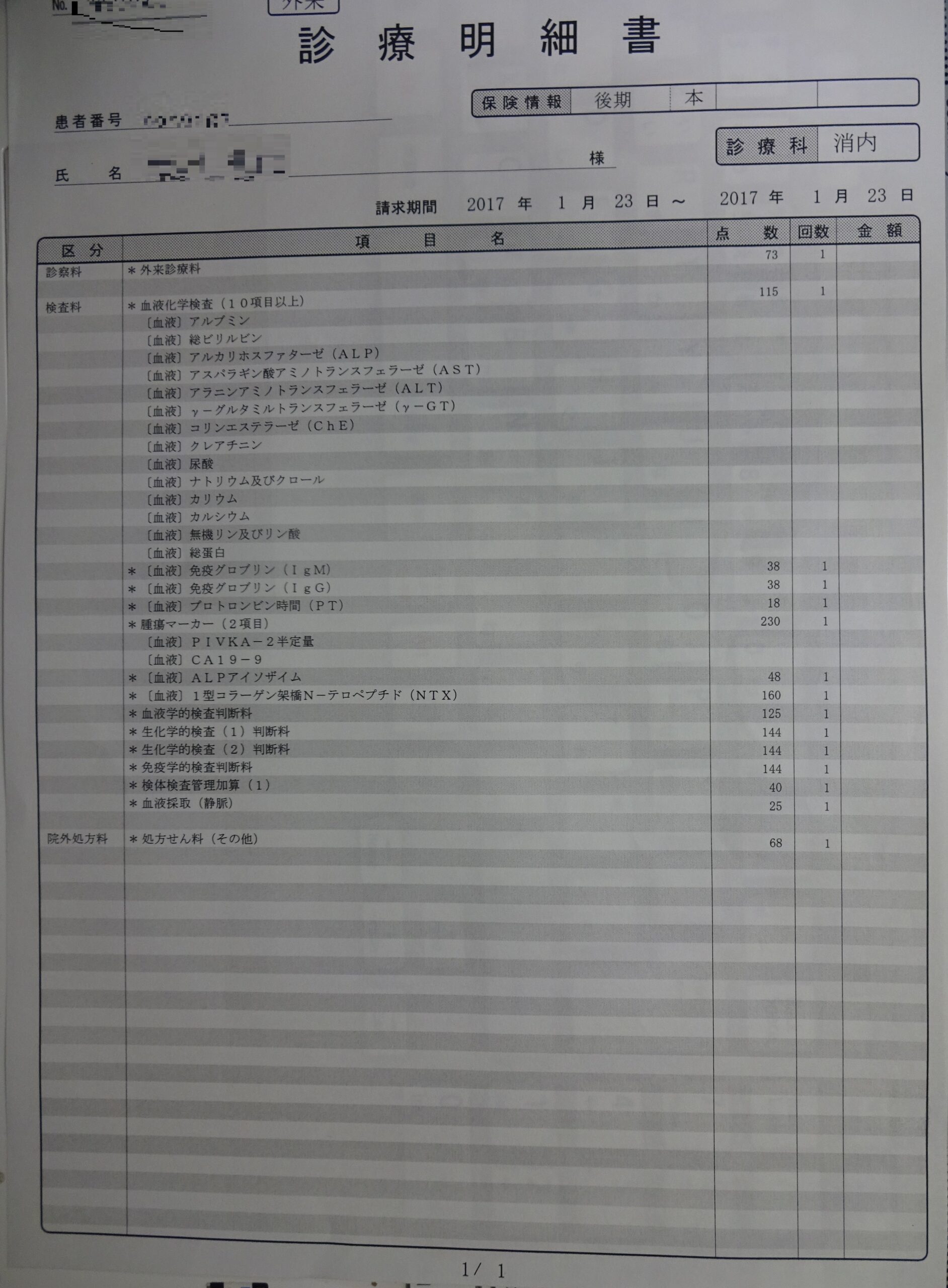ところで、前回 すなわち 1月23日の初診のときに、下の診療明細書のように 相当な保険診療点数を支払って 血液検査をされていますが、この血液検査を注文した 「野内 俊彦」という 消化器内科医は、具体的な検査項目を訊かなければ 結果を伝えてくれませんでした。例えば、肝機能では プロトロンビン時間(略語:P.T.)も大切ですし、腫瘍マーカーの検査もしています。しかも、肝・胆・膵のエコー検査があり、母親が 予定時間を超える 20分以上に亘って 何度も 医療用超音波プローブ(探触子)を 腹部の同じ個所に当てられて 当方に 不快を感じた と訴えたにもかかわらず、その結果につきましても 何の言及もありませんでした。そのうえ、パソコンの方を向いたままであり こちらを向くこともなく、話すときも パソコンの方に向かって 話していました。因みに、去る2月14日(火)の「整形外科・外来受診の付き添い・7(両親の食事)」のブログの上段に、