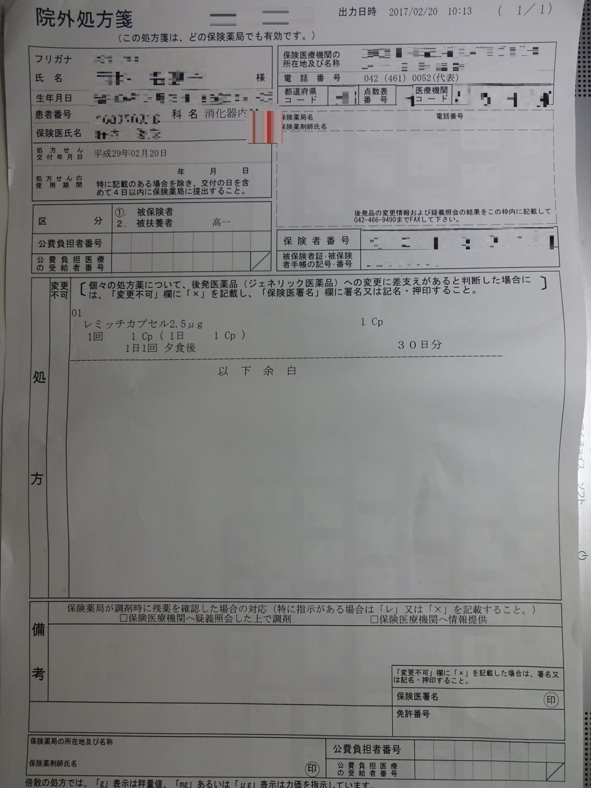 それで、前述の消化器内科医によりますと、高い薬を処方するが いいですね とのことでした。すなわち、下の画像(院外処方箋)のように ナルフラフィン塩酸塩(商品名:レミッチ・カプセル2.5μg)でした。因みに、帰宅して 調べましたら、元々 この薬の適応は 「血液透析患者における itchingの改善」とのことでした。末梢性ではなく 中枢性の itchingに働くそうです。この薬の半減期は、14時間±5時間とのことでした。なお、薬価は、1カプセル当たり 1346.3円とのことです。近くの調剤薬局では 扱っていなくて、取り寄せになるかもしれませんね。