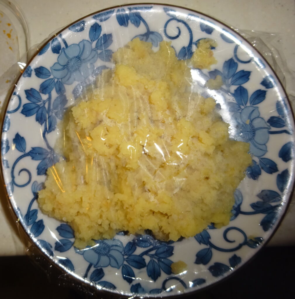 国産の 生姜(上記のように、フード プロセッサーを用いて すりおろしました。因みに、卯の花[おからのこと]のようだ と話しましたら、誠に有り難いことに 家政婦さんが同意してくれました)