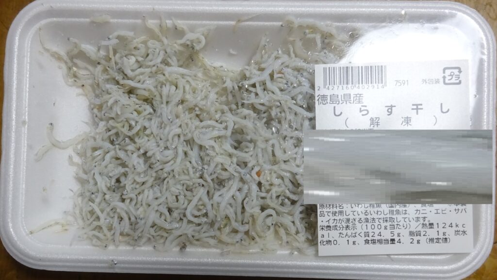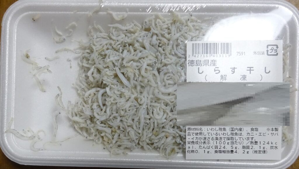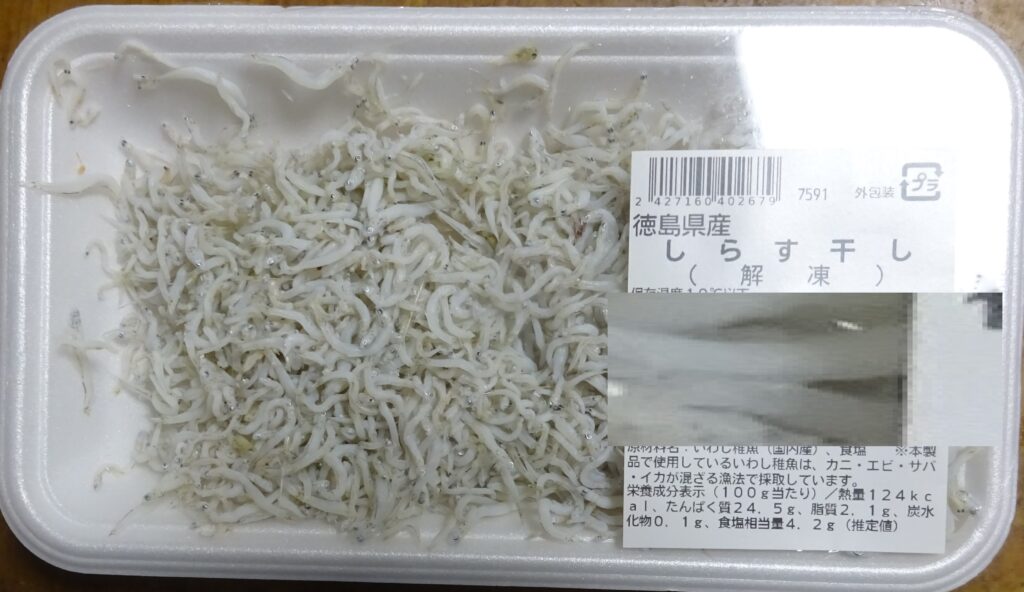 国産の しらす干し(家政婦の為の商品です。因みに、去る 一昨年の8月2日(火)の「西・2(マドリード)」のブログの中段やや下に、片口鰯 のことを記させて頂きました。なお、御承知のように しらすは、その片口鰯の稚魚であります)
