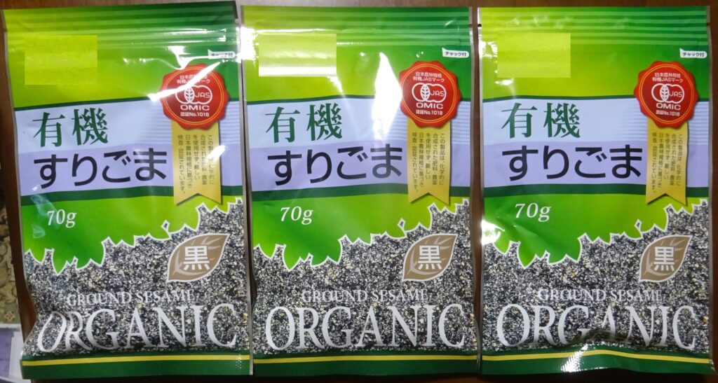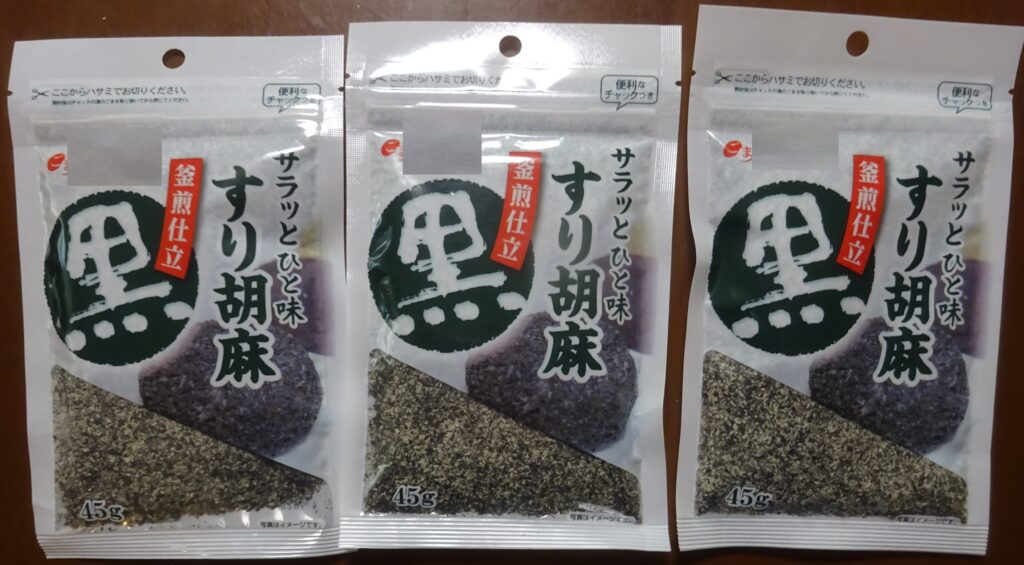 ところが、会計のときには バーコードを読み取る為に そのビニール袋が邪魔になりますので、取って 持ってきた方が いいでしょうかね と しばしば 訊いています。そして、会計で ビニール袋を被せてもらう 手間を省略してもらう為に、予め ビニール袋を被せていることを伝えました。そうして、以前 前述致しました 年配男性店員が 会計で 間違ったようには ならないように、黒胡麻は 下の画像のように 4袋であることを話しました。また、梅干は 7パックであることを伝えました。序で乍ら、当家には 大勢が居ると思ったことでありましょう。因みに、梅干は 8パックを買う予定でありましたが、売り場に 8パックしか なかったので、上記のように 「関東の一つ残し」を行ないまして、7パックを購入しました。すなわち、次に 買い物に来る お客さんの為であります。つまり、今回も、次に 買い物に来る お客さんの為に、上記の 「関東の一つ残し」を行ないました。そして、次に 買い物に来る お客さんの為であり、「関東の一つ残し」であることを 話の流れで その年配女性店員にも話しました。なお、時間帯が違うから 会わないのであるとの話になりました。それで、見えたら また 並びますから 宜敷く お願いしますと伝えました。すると、誠に有り難いことに、点数になるので 喜んでくれました。序で乍ら、午前9時半頃に行きましたが、誠に有り難いことに 寒くなりました。因みに、そのスーパー・マーケットへは、自転車で通っております。なお、往路で 中年女性が 対向から こちらに来ましたので、「御免なさい。どうぞ。」と 言って 道を譲りました。