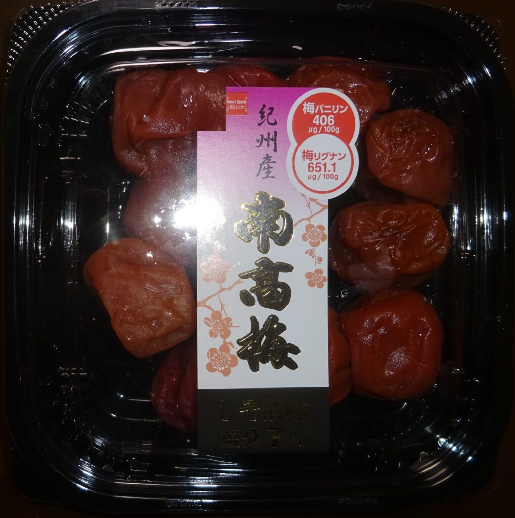 国産の 梅干(この梅干には バニリンが含まれていて、脂肪細胞の肥大 や 増加を防ぐ効果があると云われています。また、去る 11年前の11月24日(月)の「抗酸化物質」のブログを記させて頂きました。 因みに、ポリフェノールの一種で 抗酸化作用がある リグナン[英語: lignan]も 含まれています。因みに、家政婦さんに あげました)
