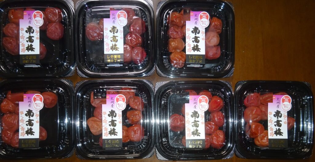 ところが、会計のときには バーコードを読み取る為に そのビニール袋が邪魔になりますので、取って 持ってきた方が いいでしょうかね と しばしば 訊いています。そして、会計で ビニール袋を被せてもらう 手間を省略してもらう為に、予め ビニール袋を被せていることを伝えました。そうして、以前 前述致しました 年配男性店員が 会計で 間違ったようには ならないように、らっきょうは 下の画像のように 4袋であることを話しました。また、黒胡麻は 5袋 そして 梅干は 7パックであることを伝えました。序で乍ら、当家には 大勢が居ると思ったことでありましょう。因みに、梅干は 8パックを買う予定でありましたが、売り場に 8パックしか なかったので、上記のように 〔関東の一つ残し〕を行ないまして、7パックを購入しました。すなわち、次に 買い物に来る お客さんの為であります。つまり、今回も、次に 買い物に来る お客さんの為に、上記の 〔関東の一つ残し〕を行ないました。そして、次に 買い物に来る お客さんの為であり、〔関東の一つ残し〕であることを 話の流れで その年配女性店員にも話しました。なお、去る 5年前の2月12日(水)の〔笑いと菜食療法❤菜食に導かれた過程❤小乗から 大乗へ・中編〕のブログの中段に、