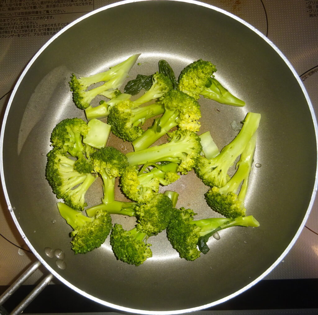 国産の ブロッコリー(家政婦さんによりますと、このブロッコリーが 硬いとのことでありました。因みに、誠に遺憾なことに、その家政婦さんによりますと、今回は 蒸らさなかったとのことでありました。それで、もう一度 火にかけて 余熱を利用するように伝えました)