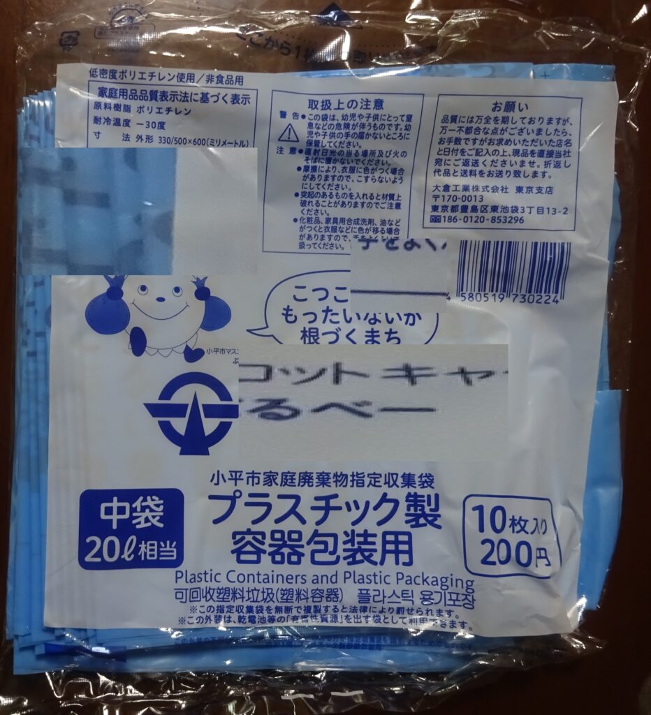 ときに、食事には、下の画像の 当市の家庭廃棄物指定収集袋(プラスチック製容器包装用・大袋 20ℓ相当)、国産の 桃、国産の 苺、国産のトマト、国産のミニ トマト、国産の 胡瓜、国産の スナップ・えんどう、国産の大根、国産の 蕪、国産の白菜、わさび(山葵:日本原産です)漬け、国産の 白菜の漬物、国内製造の 生姜、国産の 梅干、国産の らっきょう漬け、千葉の落花生、国産の 小豆、黒胡麻、国内製造の 黒胡麻豆腐、国産の 焼き海苔、国産の 生椎茸、国産の ひらたけ、国内製造の 胡麻油 そして 去る 9年前の12月2日(金)の「両親の食事・24」のブログの中段やや下に、