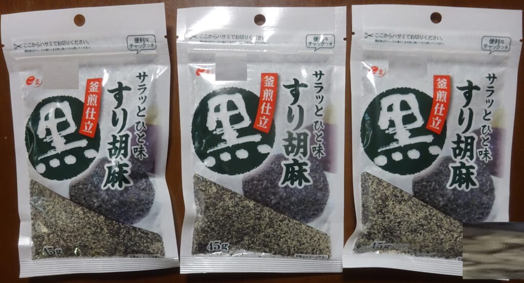 ところが、会計のときには バーコードを読み取る為に そのビニール袋が邪魔になりますので、取って 持ってきた方が いいでしょうかね と しばしば 訊いています。そして、会計で ビニール袋を被せてもらう 手間を省略してもらう為に、予め ビニール袋を被せていることを伝えました。そうして、以前 前述致しました 年配男性店員が 会計で 間違ったようには ならないように、黒胡麻は 下の画像のように 4袋であることを話しました。また、梅干は 7パックであることを伝えました。序で乍ら、当家には 大勢が居ると思ったことでありましょう。因みに、梅干は 8パックを買う予定でありましたが、売り場に 8パックしか なかったので、上記のように 『関東の一つ残し』を行ないまして、7パックを購入しました。すなわち、次に 買い物に来る お客さんの為であります。つまり、今回も、次に 買い物に来る お客さんの為に、上記の 『関東の一つ残し』を行ないました。そして、次に 買い物に来る お客さんの為であり、『関東の一つ残し』であることを 話の流れで その年配女性店員にも話しました。なお、時間帯が違うから 会わないのであるとの話になりました。それで、見えたら また 並びますから 宜敷く お願いしますと伝えました。すると、誠に有り難いことに、点数になるので 喜んでくれました。序で乍ら、午前9時半頃に行きましたが、誠に有り難いことに 寒くなりました。因みに、そのスーパー・マーケットへは、自転車で通っております。なお、往路で 中年女性が 対向から こちらに来ましたので、『御免なさい。どうぞ。』と 言って 道を譲りました。