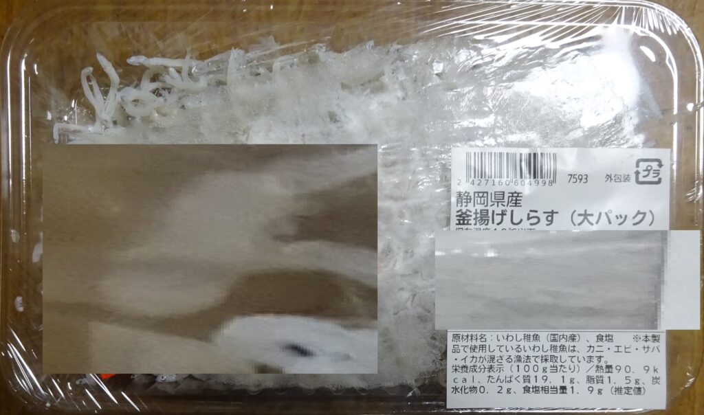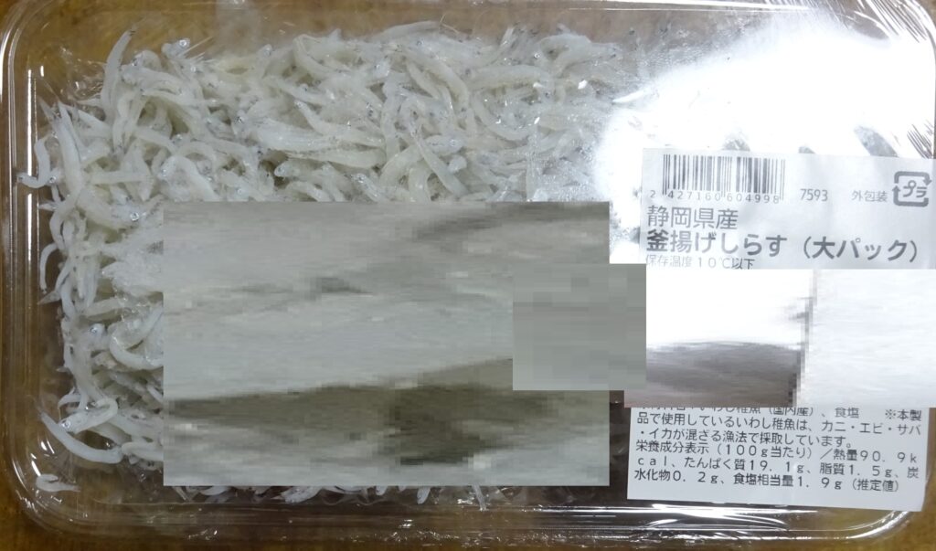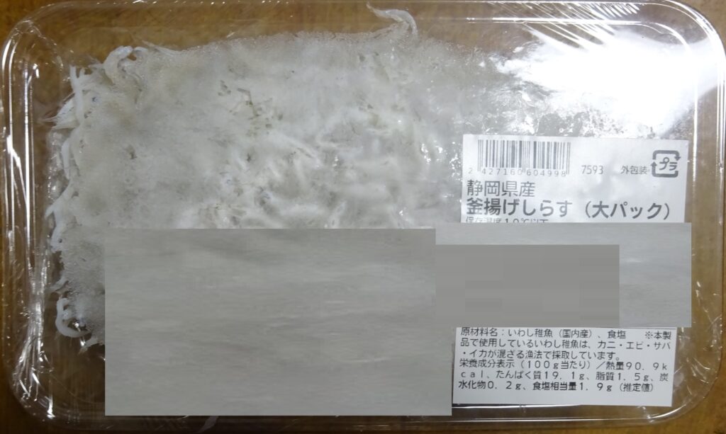 国産の しらす干し(家政婦の為の商品です。因みに、去る 一昨年の8月2日(火)の「西・2(マドリード)」のブログの中段やや下に、片口鰯 のことを記させて頂きました。なお、御承知のように しらすは、その片口鰯の稚魚であります)