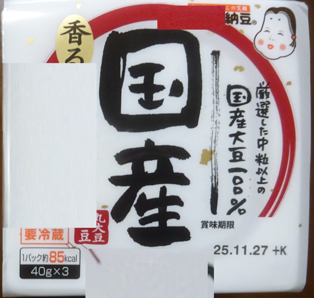 国産の 納豆(賞味期限の後に記載されている「+K」は、製造を行った特定の工場を表す社内管理用の略号)