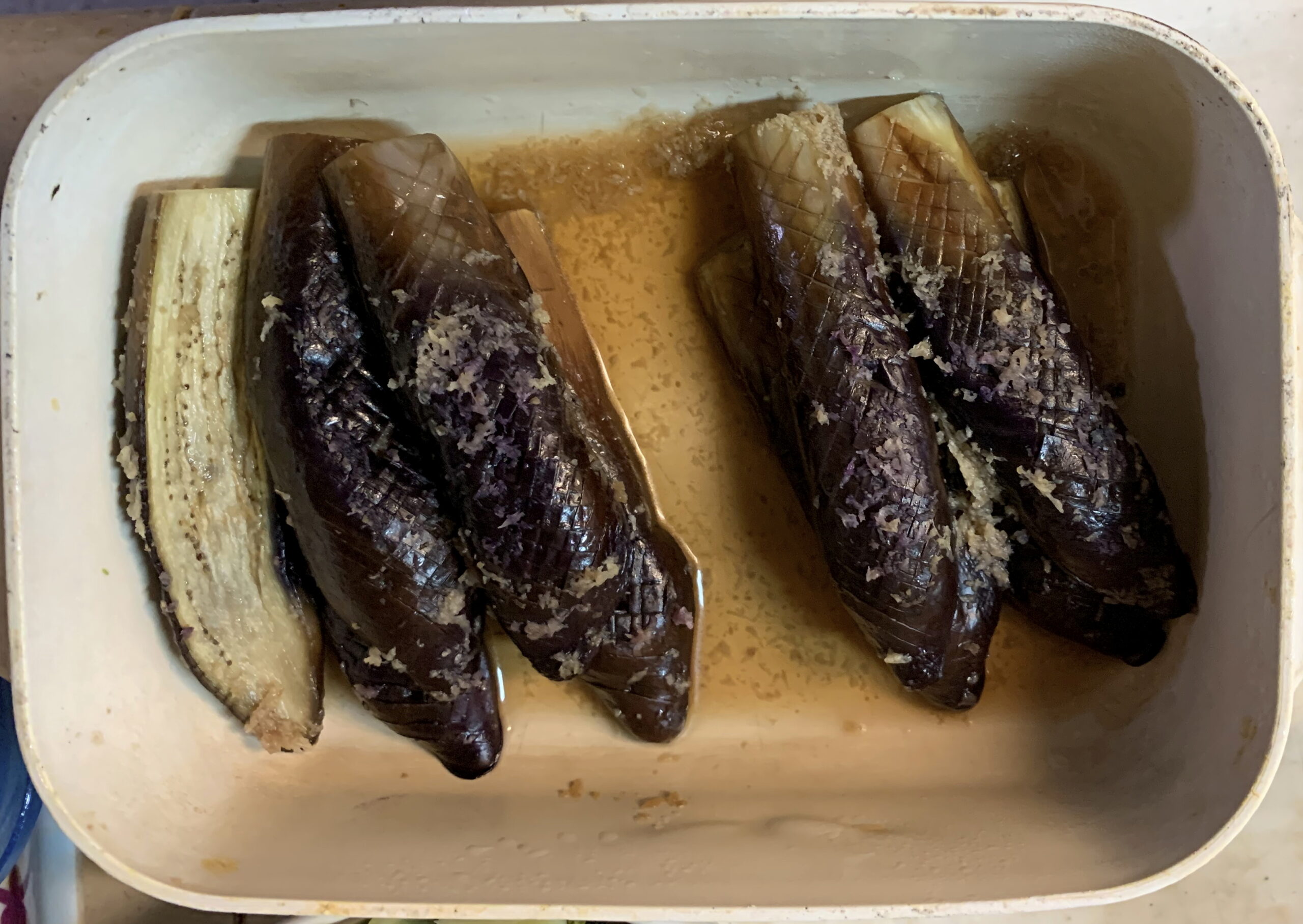 ピーマン と 茄子なす生姜しょうが焼き(茄子なすを 水で らして 調理したので 時間がかった とのむね でありました。しかも、その家政婦によりますと、茄子なすは 時間がかっても 化粧包丁を入れないと 油を吸わないので 出来ないとのことでありました。そのうえ、その家政婦によりますと、生姜しょうがを入れ過ぎて からくなったので、みりんを加えたとのことでありました。但し、これでは 今度は 甘くなり過ぎてしまうと思われました)