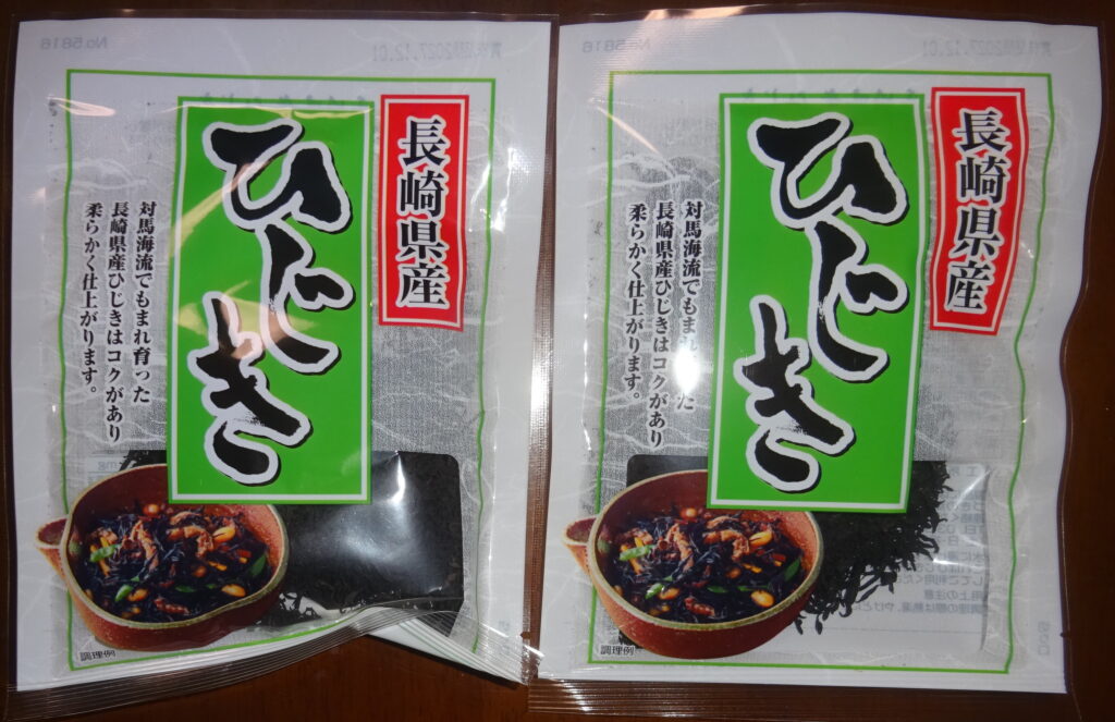 国産の ひじき 2袋(家政婦さんによりますと 賞味期限は 同じとのことでありますが、当然のことながら 毎回 購入するたびに 賞味期限は変わっています。それで、購入すると 下に置いて 上から 使ってもらうようにしていることを伝えました)