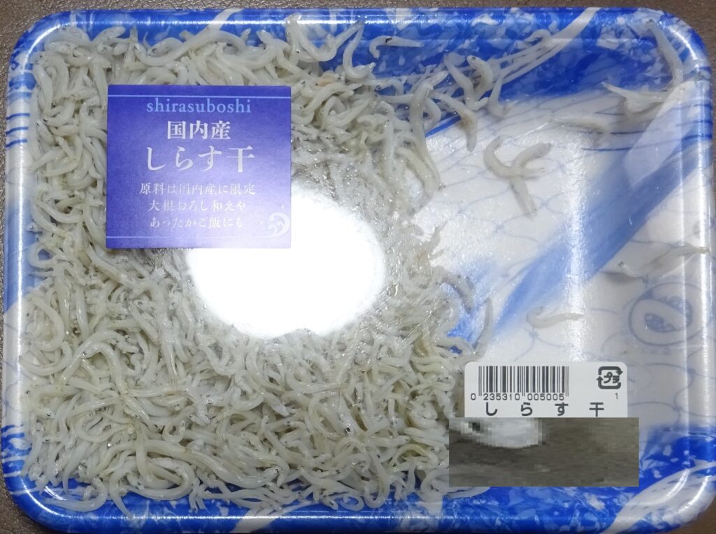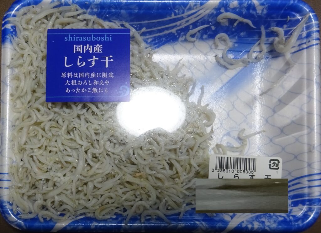 国産の しらすし(家政婦のための商品です。ちなみに、去る 4年前の8月2日(火)の「西スペイン・2(マドリード)」のブログの中段やや下に、片口鰯かたくちいわし のことを記させて頂きました。なお、御承知のように しらすは、その片口鰯かたくちいわしの稚魚であります)