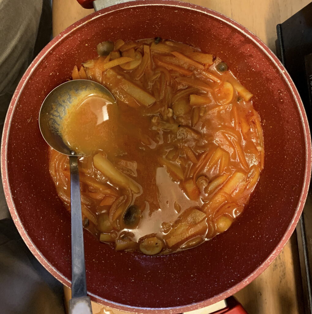 トマト(誠に遺憾なことに、家政婦さんは、いつも 玉葱たまねぎを2個 入れるのでありますが、今回は 何故なぜ勘違かんちがいをして 1個しか 入れませんでした)