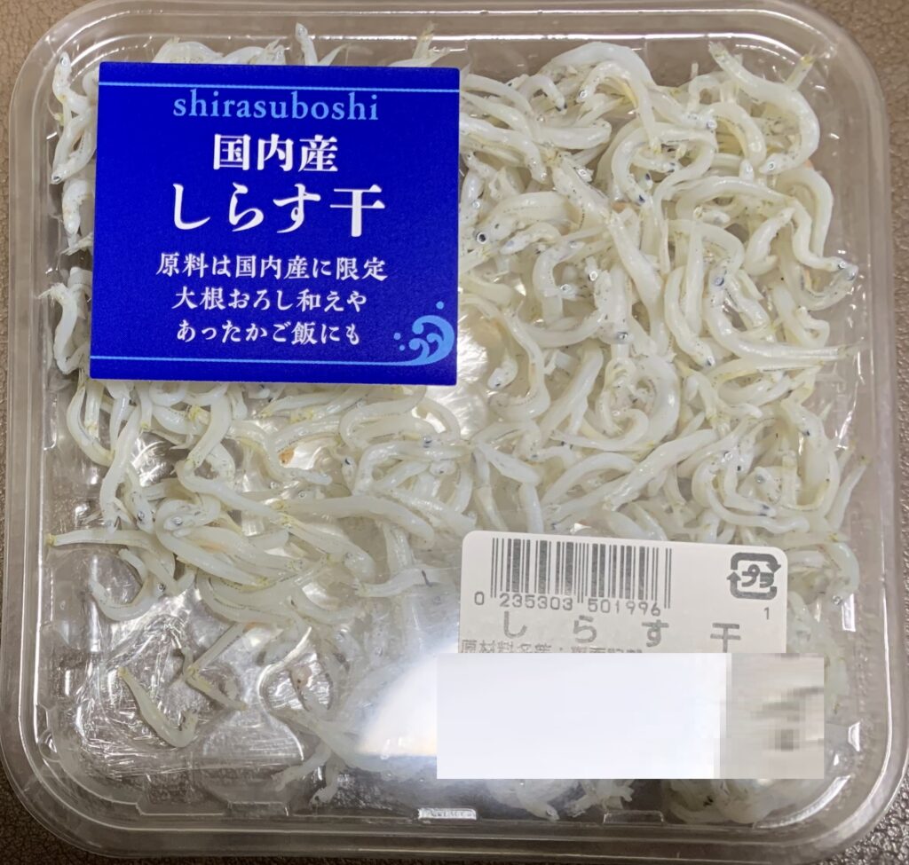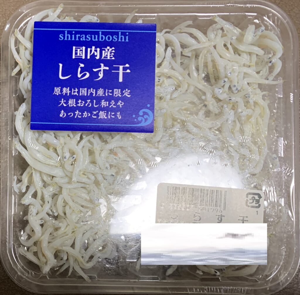 国産の しらすし(家政婦のための商品です。ちなみに、去る 4年前の8月2日(火)の「西スペイン・2(マドリード)」のブログの中段やや下に、片口鰯かたくちいわし のことを記させて頂きました。なお、御承知のように しらすは、その片口鰯かたくちいわしの稚魚であります。ついながら、25gの商品しか 売られなくなりました)