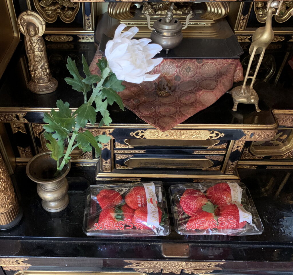 御仏壇に そなえた 両親の好物だった 国産の いちご(前述の 去る 一昨々年さきおととしの1月28日(土)の「菜食のおかず・299(買い物)」のブログの中段やや上に、「(前略)生前 母親によりますと、お皿に 牛乳を満たして その上に 盛った いちごを 浮かべた 光景を見るのが好きと話していました。(後略)」と記させていただきました)