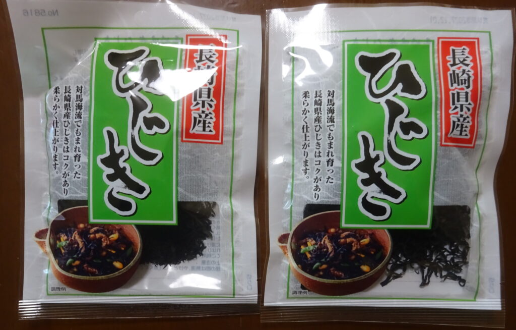 国産の 芽ひじき 2袋(家政婦さんによりますと 賞味期限は 同じとのことでありますが、当然のこと乍ら 毎回 購入する度に 賞味期限は変わっています。それで、購入すると 下に置いて 上から 使ってもらうようにしていることを伝えました)