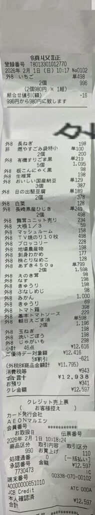 因みに、『済みません。御免なさい。』という言葉が 店内に交差していました。なお、そのスーパー・マーケットへは、自転車で通っております。序で乍ら、去る2月1日(日) の『駅伝大会・7(令和8年)』のブログの下段に、『(前略)この日は 上記の事情により 誠に異例なことに、午前9時19分から 午前11時6分迄 の長時間 買い物に時間を取られました。それで、自転車で 往復する 途中で 応援しました。因みに、その今年の第46回某・市民駅伝大会のコースは 歩道も通ることが適いませんでした。そこで、スーパー・マーケットへの道は 迂回しました。なお、復路では、そこが 当家ですと 係員の年配男性に伝えて 歩道を通りました。そして、帰宅しましたら、今年の第46回某・市民駅伝大会は 終了して 後片付の最中でありました。(後略)』と記させていただきました。すなわち、上記のように、そのスーパー・マーケットを往復するのに たいへん 苦労しました。しかも、上記の事情により 誠に異例なことに、長時間 買い物に時間を取られました。それで、帰宅しましたら、誠に遺憾なことに、その某・市民駅伝大会は 終了して 後片付の最中でありました。序で乍ら、往路で 中年男性が 対向から こちらに来ましたので、『御免なさい。どうぞ。』と 言って 道を譲りました。但し、相手の中年男性は 擦れ違うときに 何も言いませんでした。(後略)」と記させていただきました。