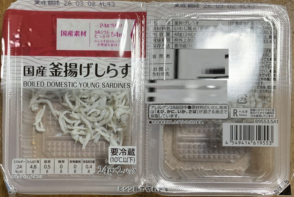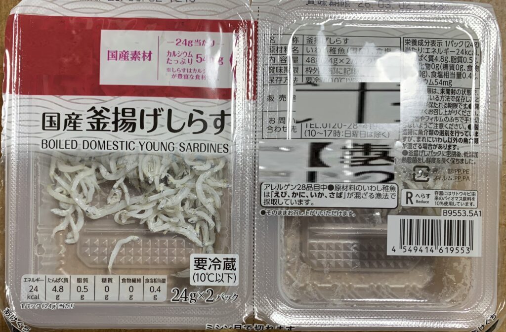 国産の しらす干し(家政婦の為の商品です。因みに、去る 4年前の8月2日(火)の「西・2(マドリード)」のブログの中段やや下に、片口鰯 のことを記させて頂きました。なお、御承知のように しらすは、その片口鰯の稚魚であります)