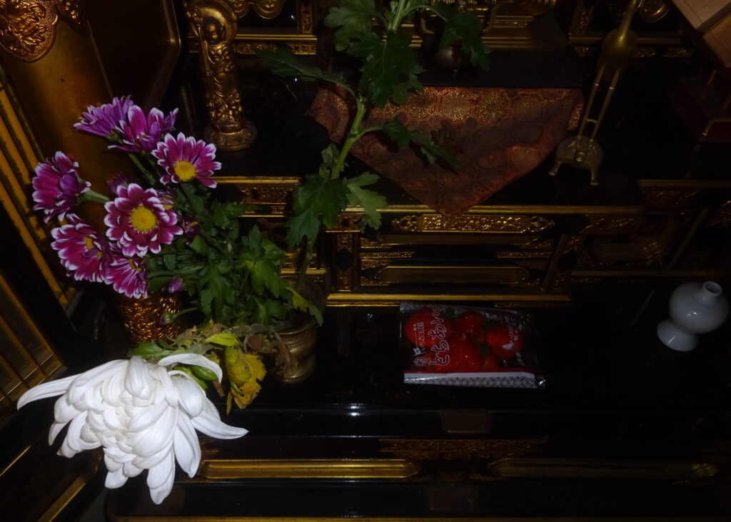 御仏壇に 供えた 両親の好物だった 国産の 苺(前述の 去る 一昨々年の1月28日(土)の「菜食のおかず・299(買い物)」のブログの中段やや上に、「(前略)生前 母親によりますと、お皿に 牛乳を満たして その上に 盛った 苺を 浮かべた 光景を見るのが好きと話していました。(後略)」と記させていただきました)