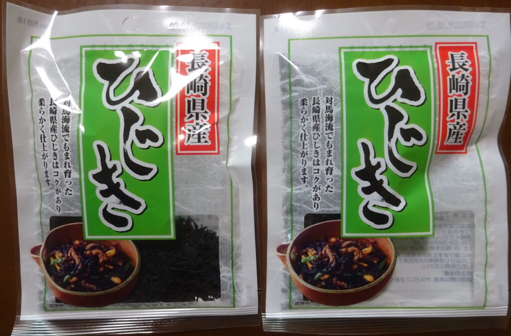 国産の ひじき 2袋(家政婦さんによりますと 賞味期限は 同じとのことでありますが、当然のことながら 毎回 購入するたびに 賞味期限は変わっています。それで、購入すると 下に置いて 上から 使ってもらうようにしていることを伝えました)