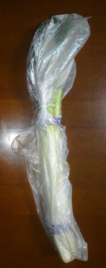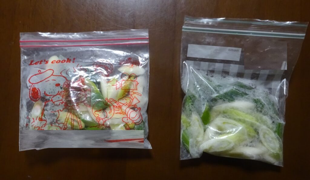 国産の ねぎ(冷凍保存しました。(ちな)みに、下に ねぎが落ちていると伝えましたら、家政婦さんによりますと、袋に入れるときに 落ちたとのことでありました。なお、その家政婦さんによりますと、最初に切るときに 冷凍保存のためねぎも 一緒に 切ればよかった とのことでありました)