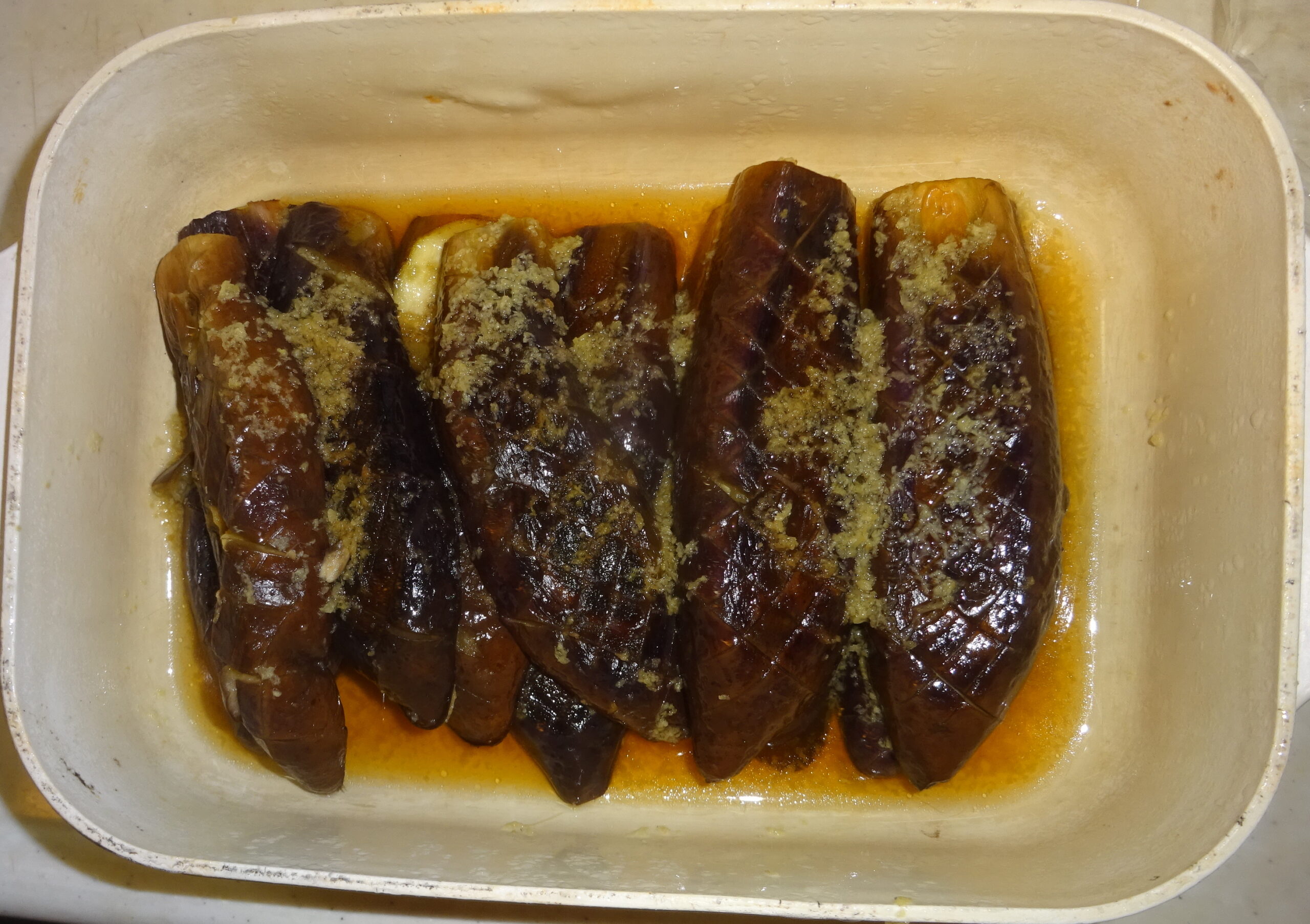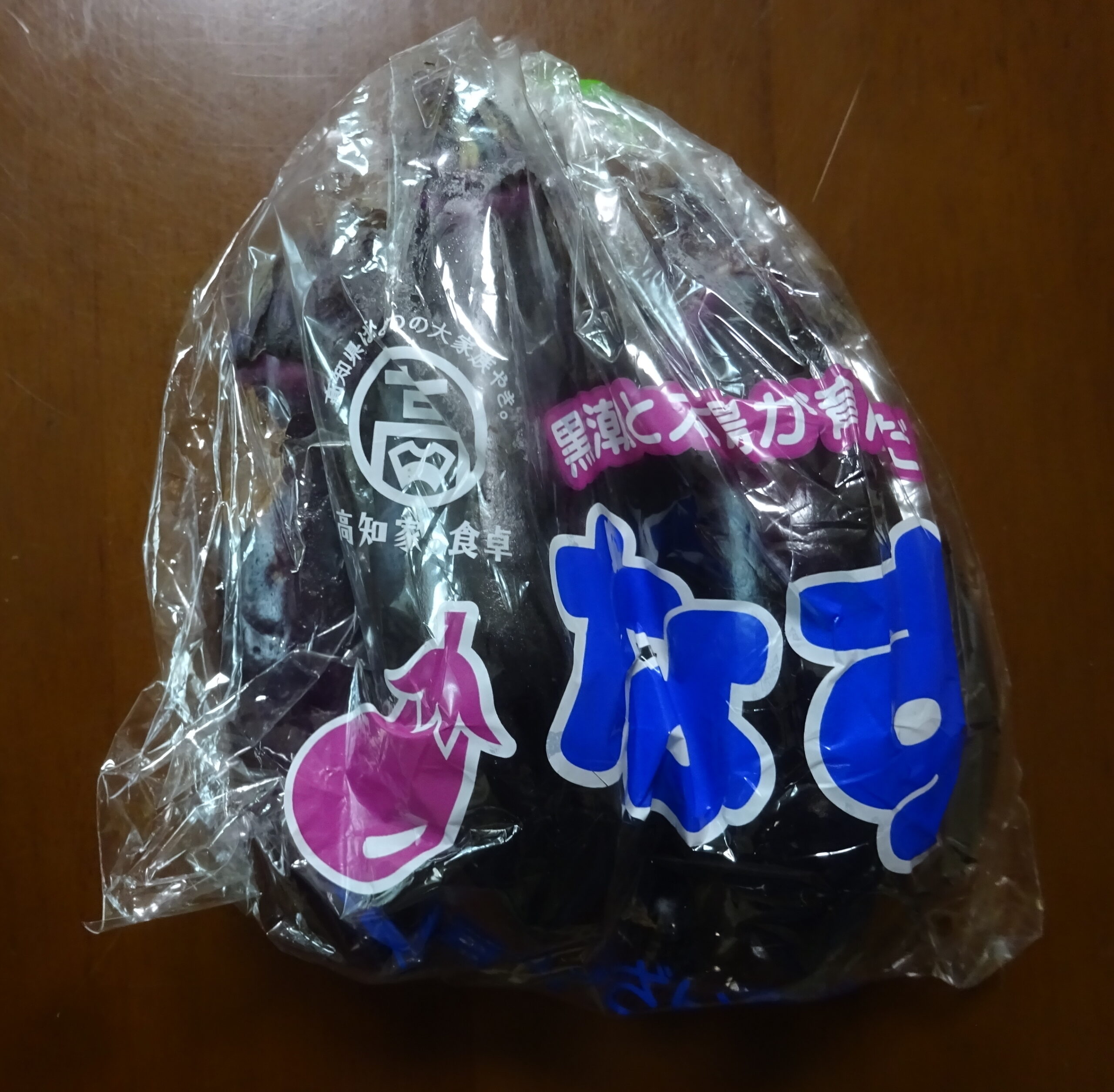 国産の 茄子なす(誠に遺憾なことに、いたんでいました)