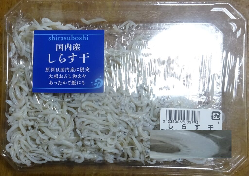 国産の しらすし(家政婦のための商品です。ちなみに、去る 4年前の8月2日(火)の「西スペイン・2(マドリード)」のブログの中段やや下に、片口鰯かたくちいわし のことを記させて頂きました。なお、御承知のように しらすは、その片口鰯かたくちいわしの稚魚であります)