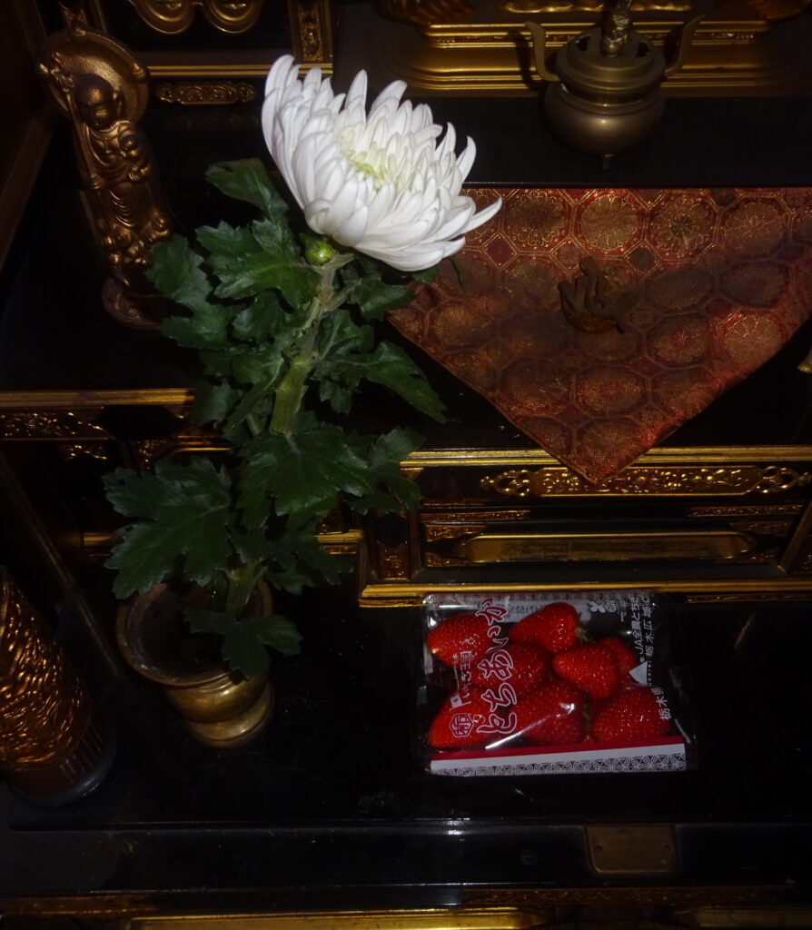 御仏壇に そなえた 両親の好物だった 国産の いちご(前述の 去る 一昨々年さきおととしの1月28日(土)の「菜食のおかず・299(買い物)」のブログの中段やや上に、「(前略)生前 母親によりますと、お皿に 牛乳を満たして その上に 盛った いちごを 浮かべた 光景を見るのが好きと話していました。(後略)」と記させていただきました)