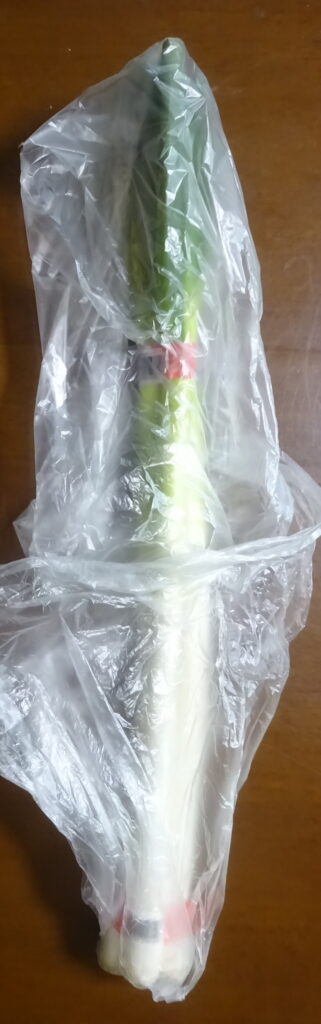 国産の ねぎ(冷凍保存しました。(ちな)みに、下に ねぎが落ちていると伝えましたら、家政婦さんによりますと、袋に入れるときに 落ちたとのことでありました。なお、その家政婦さんによりますと、最初に切るときに 冷凍保存のためねぎも 一緒に 切ればよかった とのことでありました)