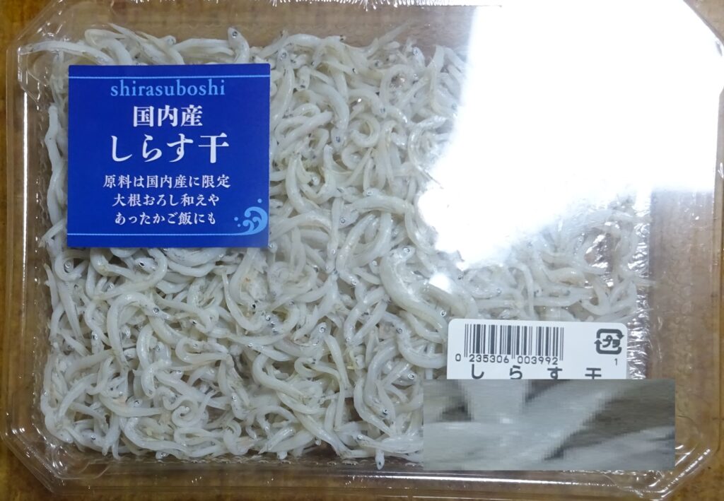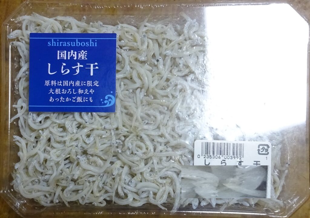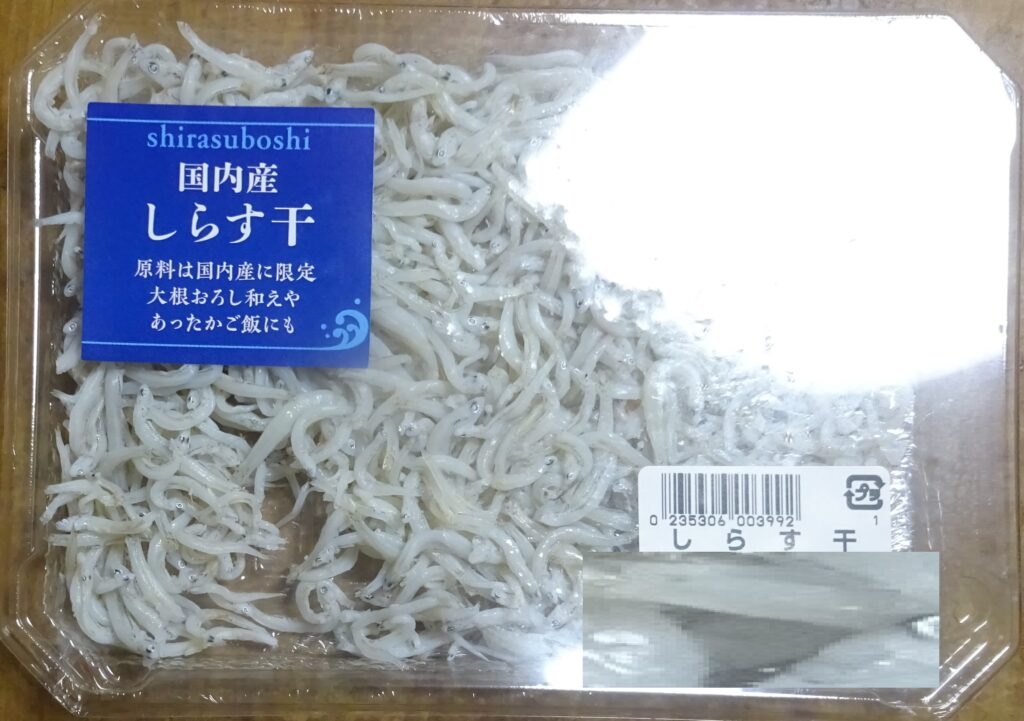 国産の しらす干し(家政婦の為の商品です。因みに、去る 4年前の8月2日(火)の「西・2(マドリード)」のブログの中段やや下に、片口鰯 のことを記させて頂きました。なお、御承知のように しらすは、その片口鰯の稚魚であります)