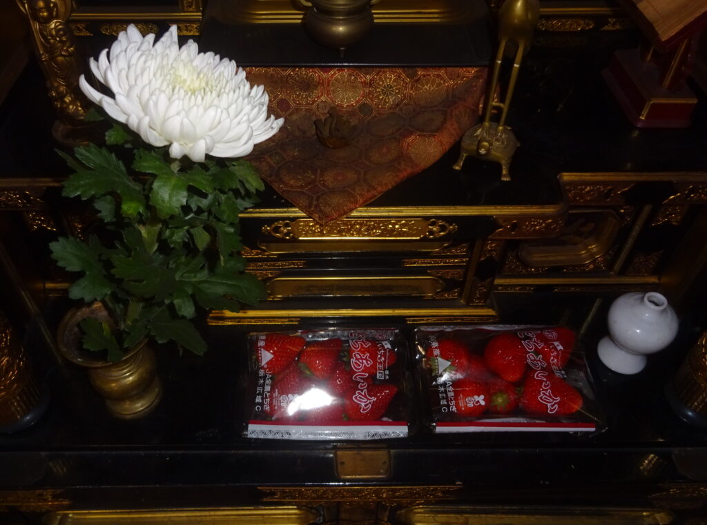 御仏壇に 供えた 両親の好物だった 国産の 苺(前述の 去る 一昨々年の1月28日(土)の「菜食のおかず・299(買い物)」のブログの中段やや上に、「(前略)生前 母親によりますと、お皿に 牛乳を満たして その上に 盛った 苺を 浮かべた 光景を見るのが好きと話していました。(後略)」と記させていただきました)