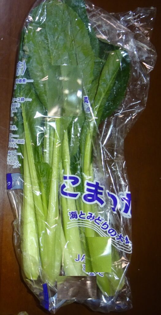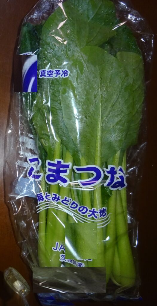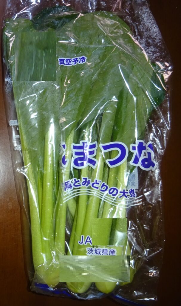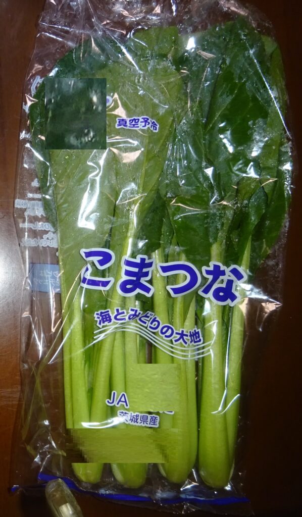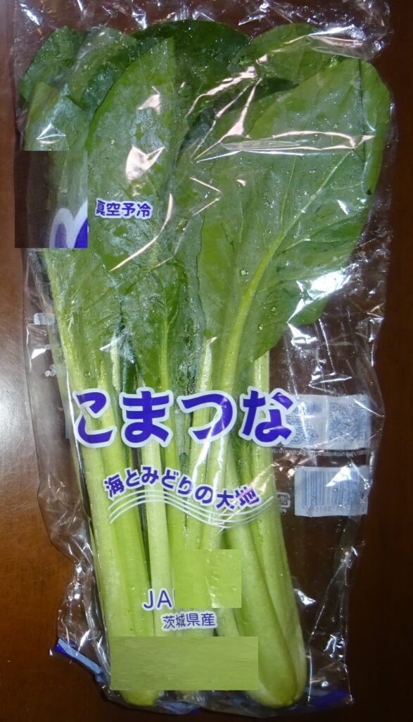 なお、下の画像の小松菜が 真空予冷されていることを伝えました。すなわち、近年 真空予冷が、主流で行われています。つまり、真空にして 野菜の水分を蒸発させ その気化熱を野菜から 奪うことにより、野菜を冷やすのであります。要するに、野菜から 奪う水分は、全体の2%であるとされております。但し、余分な水分であればいいですが、野菜の水分を奪い 乾燥させていいものであるか との話になりました。序で乍ら、家政婦さんによりますと、小松菜の調理を するのに 時間が掛かる との旨でありました。因みに、その家政婦さんによりますと、追加で 30分 煮ても 柔らかくならないとのことでありました。但し、これは、夏季の小松菜の話であります。なお、去る 一昨年の12月5日(木)の「家政婦さんの入院・続報152」のブログの中段やや下に、