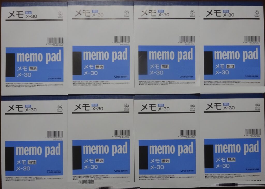 環境の 為に 再生紙を用いた メモ用紙 8冊(日本製)(今回は 店頭に 9冊しかありませんでしたので、上記のように 今回も「関東の一つ残し」を行ない 8冊を購入しました)