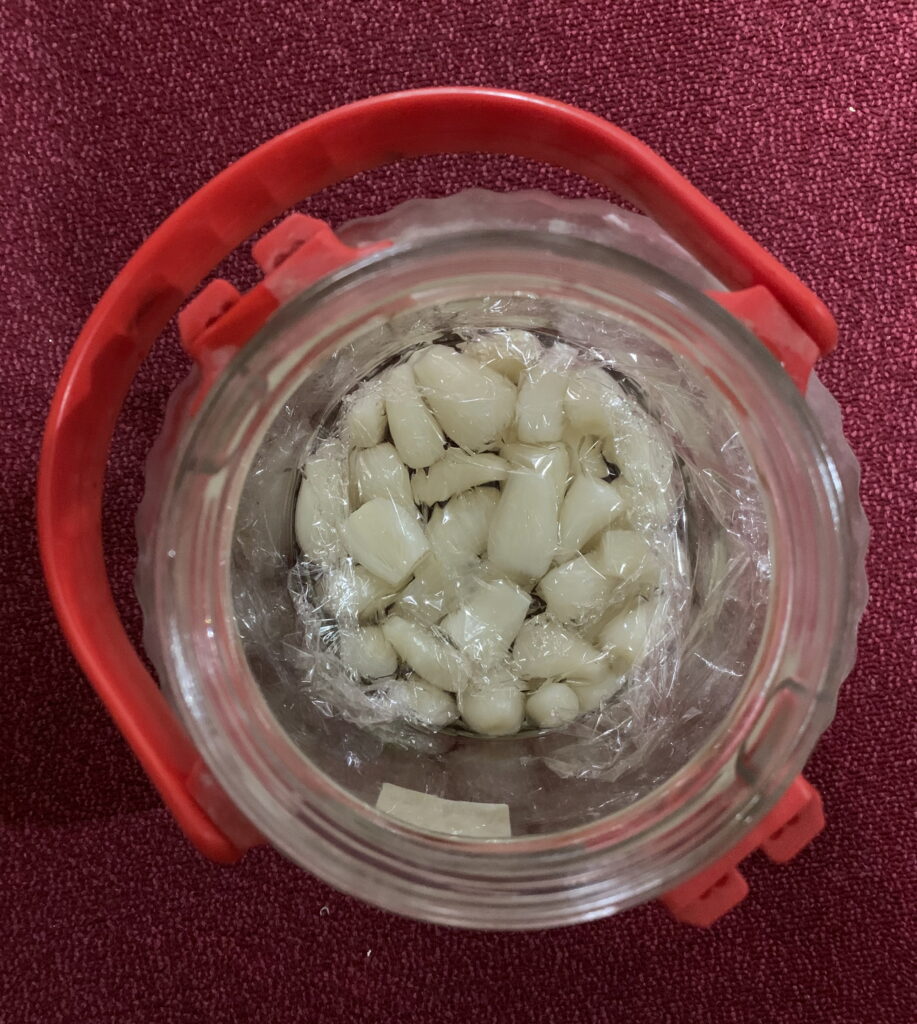 国産らっきょうを 上の容器に入れ 国産の らっきょう漬けの為の酢を注ぎ 冷蔵庫で保存します。因みに、らっきょうが 液から出ないように ラップなどで 落し蓋をします