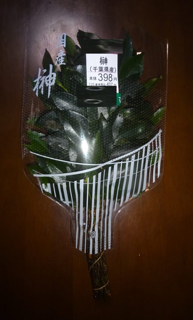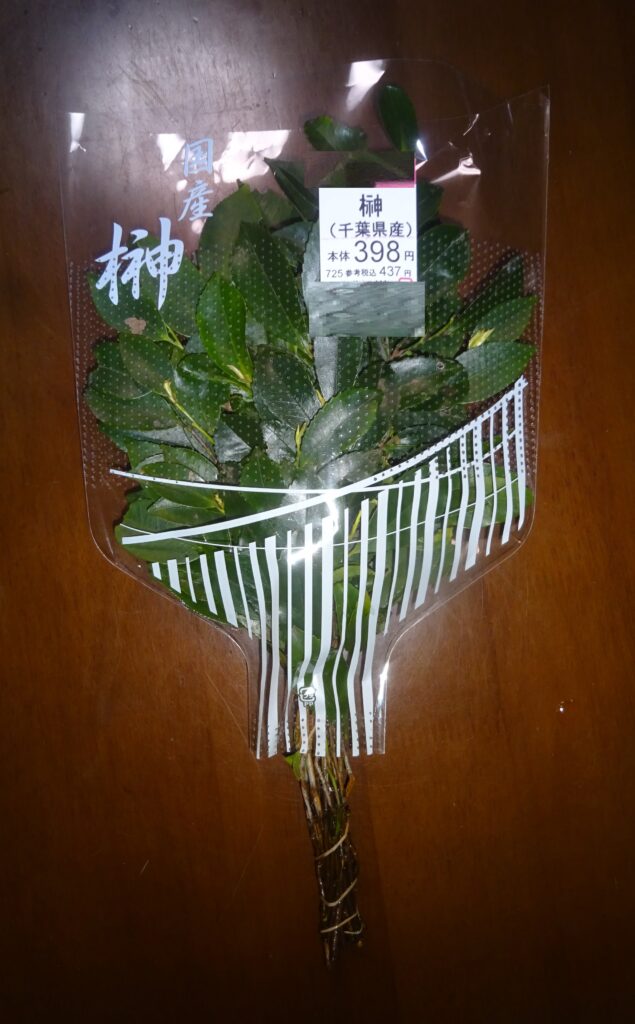 樒(国産)(前回は 国産の榊が ないので、上の画像の 国産の樒を買いました。因みに、神棚に 樒を飾ることは、主に 地域的な慣習[特に 西日本]や、榊が入手しづらい場合の代用として行われるとのことであります。但し、誠に遺憾なことに、国産の榊よりも 国産の樒の方が 早く 傷みました。それで、今回は 下の画像のように、国産の榊を選びました。ところが、春先から 初夏のは 新芽の時期であり、柔らかく 傷みやすい状態になるとのことでありました)