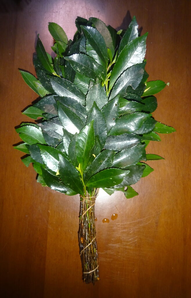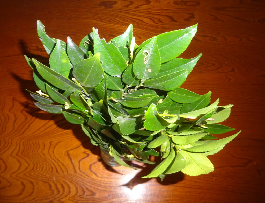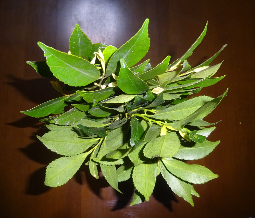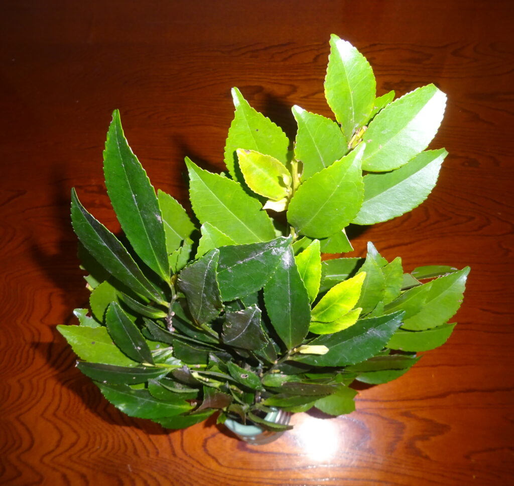 上記のように 購入した 樒(国産)(国産の榊が ないので、国産の樒を買いました。因みに、神棚に 樒を飾ることは、主に 地域的な慣習[特に 西日本]や、榊が入手しづらい場合の代用として行われるとのことであります)