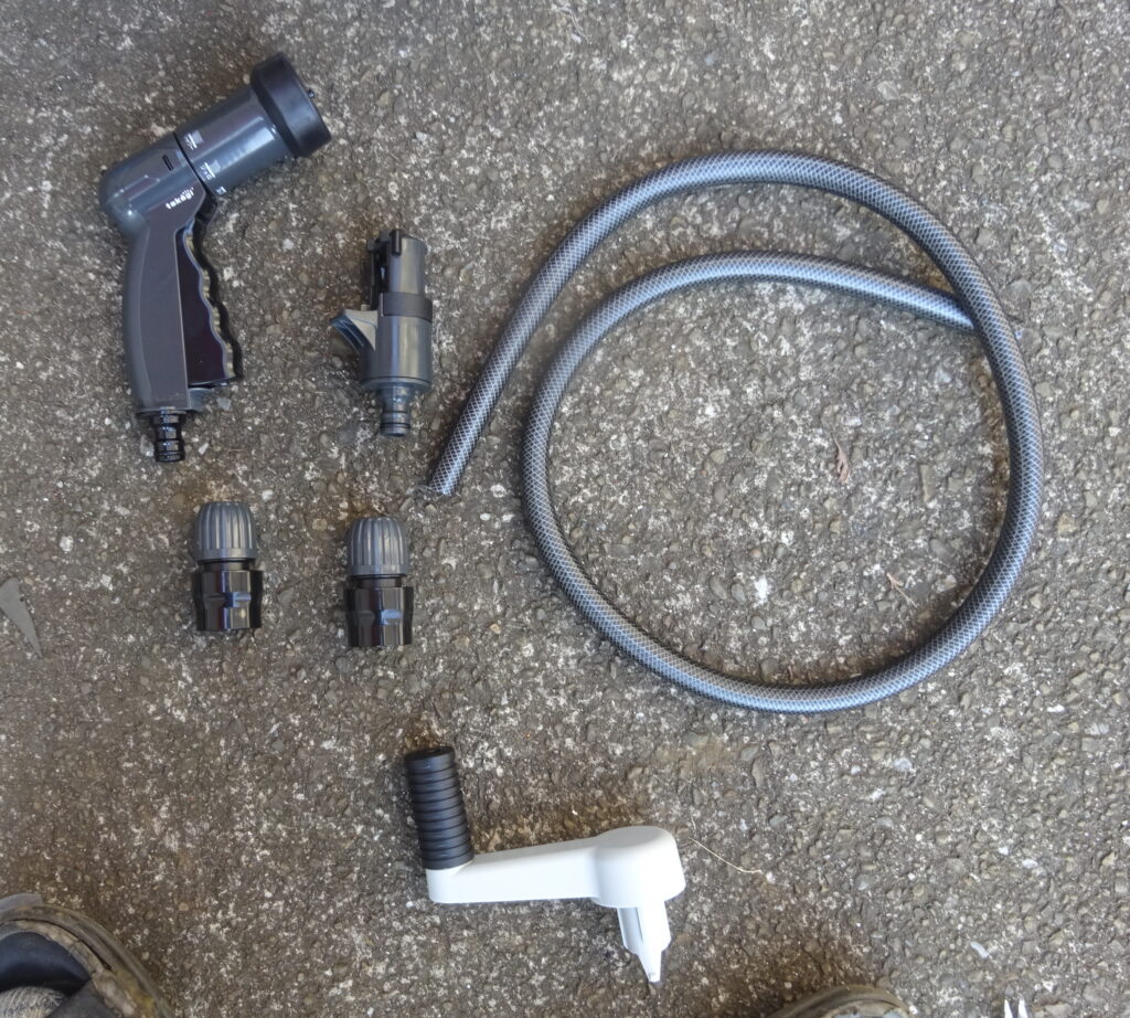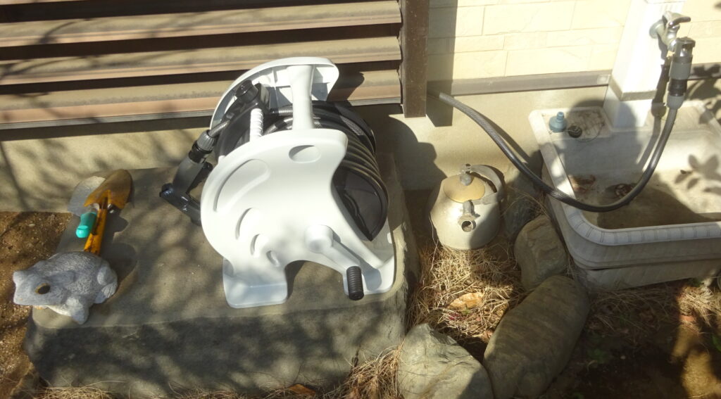 ホースリール本体に 散水ノズルを接続して、散水ホースを組み立てて 置いた様子(事前に このスペースに入ることは、計測していました。しかも、蛇口側ホースが 1.5mで 足りることも 計っておりました)
