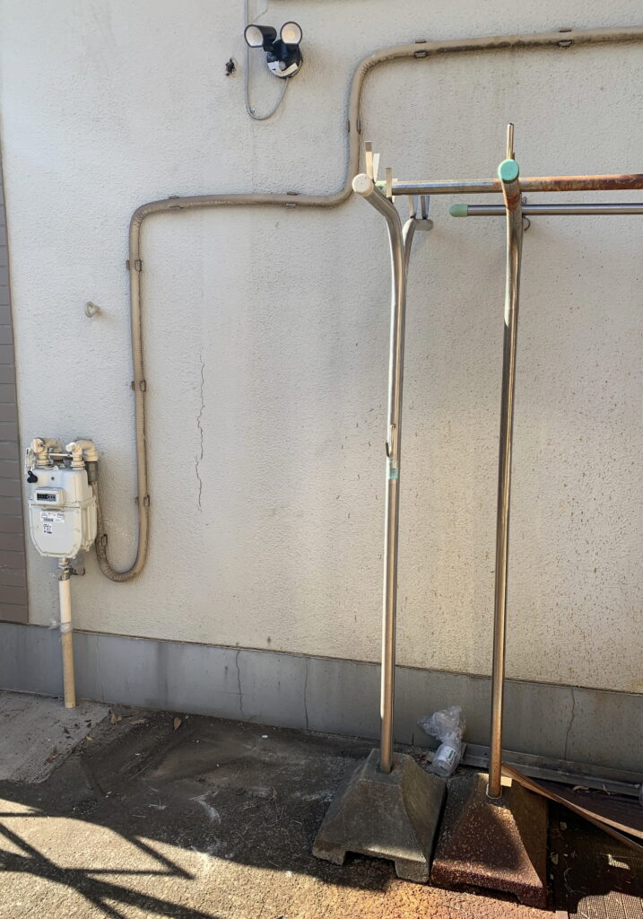 下の画像の 脚立きゃたつを使うので、重い 物干ものほし台を移動しました