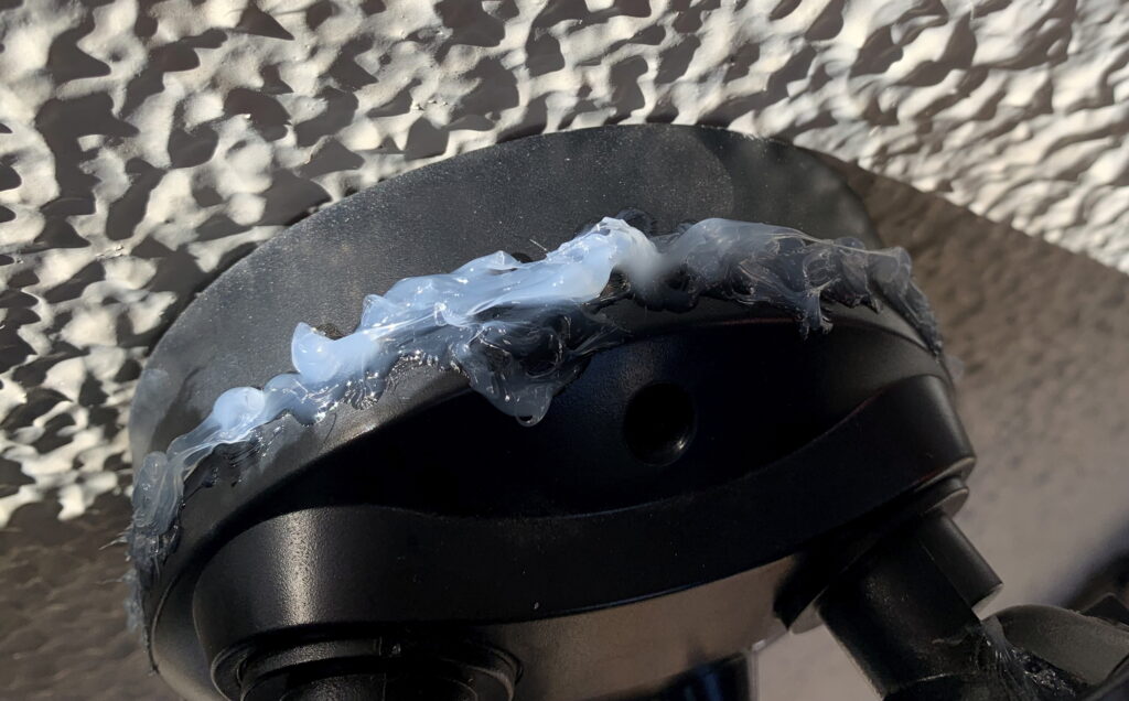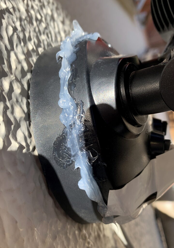 上記の取り付けベース と 防犯センサーライト 本体の間の隙間すきまに 前述いたしました コーキング剤を使いました(上から撮影)