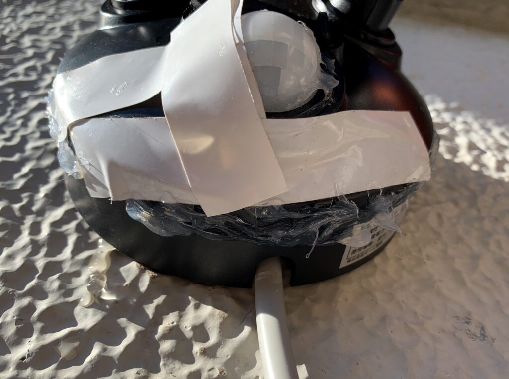 上記の取り付けベース と 防犯センサーライト 本体の間の隙間すきまに 前述いたしました コーキング剤を使いました(下から撮影)
