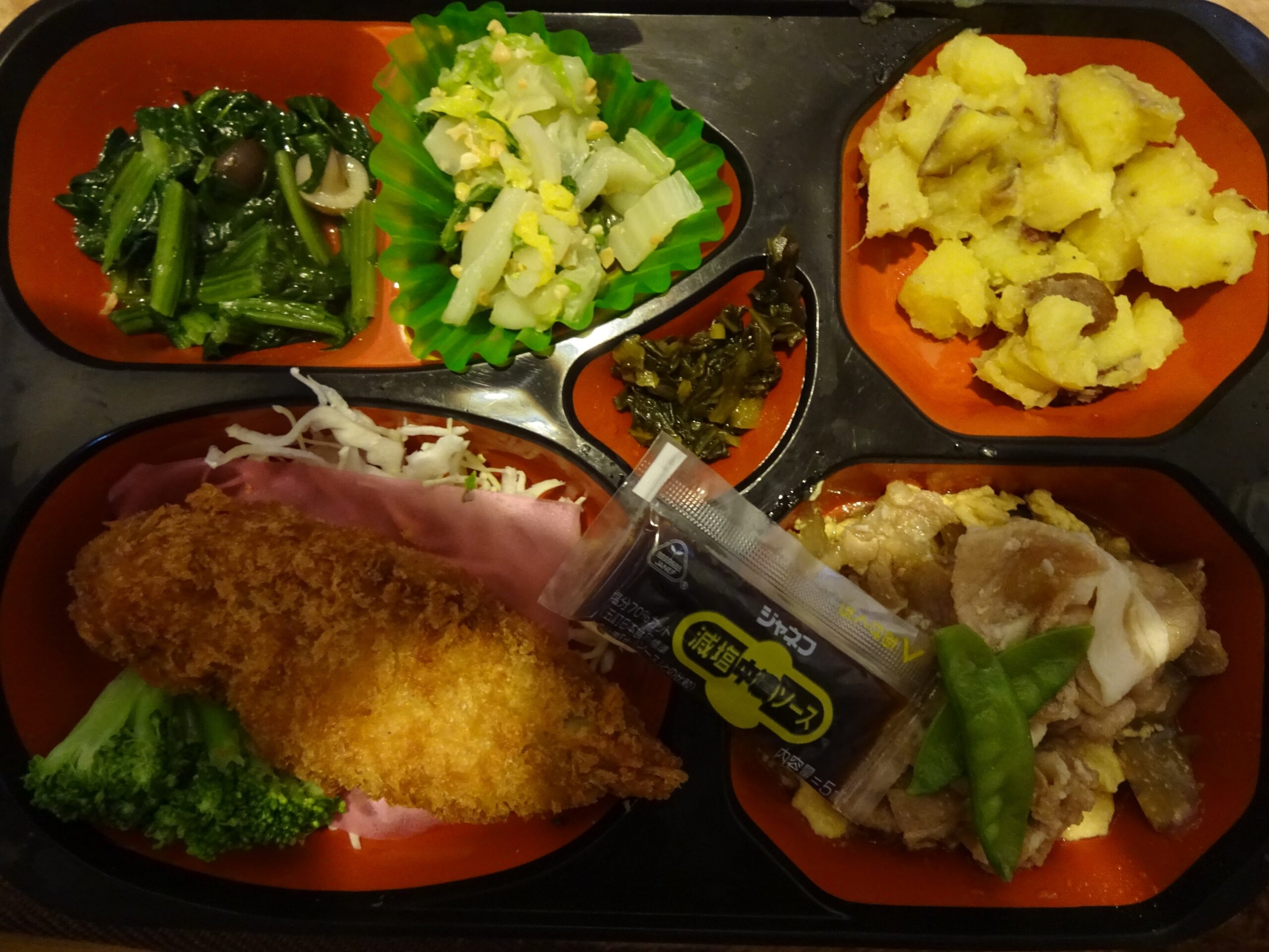 以上などが、父親の朝食 そして 昼食です。朝食も 昼食も、おかずの内容は ほぼ同じです。それから、宅食の おかずの配達が、週7日間コースと致しまして 入って来ます。なお、母親のよりますと、病人食のようである とのことでした。それで、「カロリー や 塩分などの計算がなされているのでありましょう。」と回答しました。