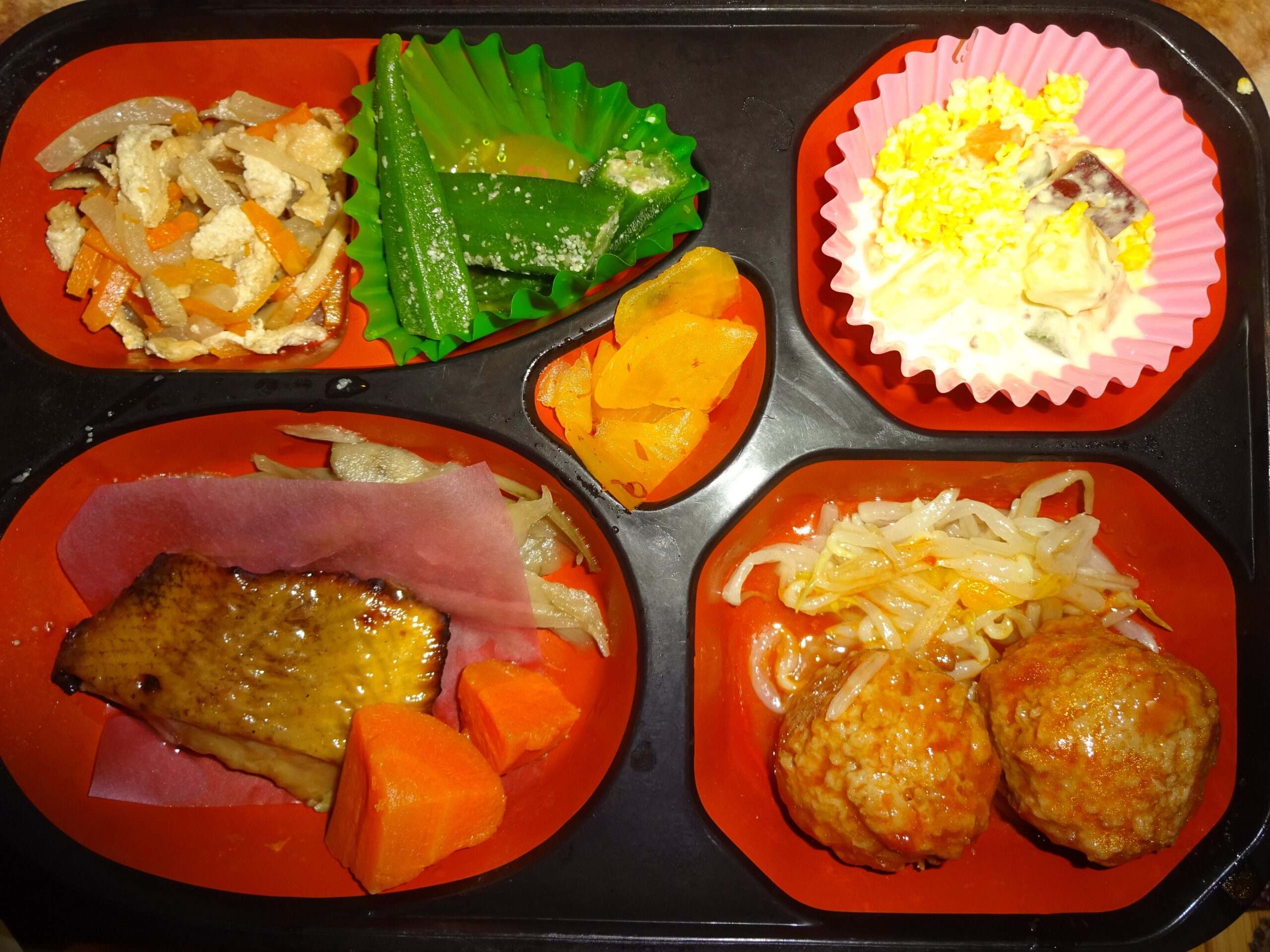 以上などが、父親の朝食 そして 昼食です。朝食も 昼食も、おかずの内容は ほぼ同じです。それから、宅食の おかずの配達が、週7日間コースと致しまして 入って来ます。なお、母親のよりますと、病人食のようである とのことでした。それで、「カロリー や 塩分などの計算がなされているのでありましょう。」と回答しました。